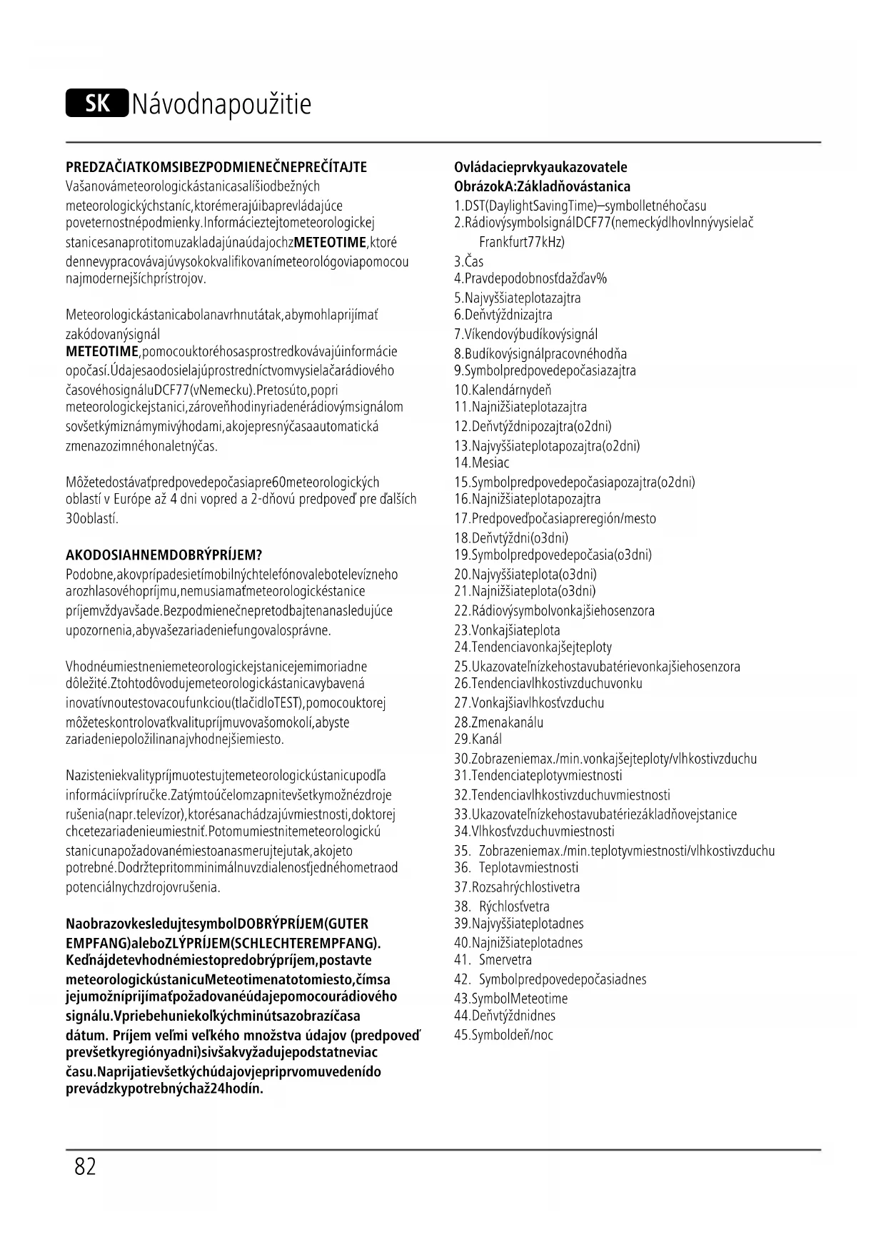 A MODE – tlačidlo = nastavenia/potvrdenie nastavenej hodnoty B CHANNEL – tlačidlo = manuálne vyhľadávanie signálu vonkajšieho senzora/výber kanála C DAY/NIGHT/SNOOZE/LIGHT – tlačidlo = prerušenie signálu budíka/aktivácia podsvietenia/prepínanie deň a noc hodnota ukazovateľa D TEST – tlačidlo = kontrola kvality signálu DCF E UP – tlačidlo = zvýšenie aktuálnej nastavenej hodnoty/načítanie uložených najvyšších/najnižších hodnôt (MAX/MIN)/údaje o počasí na nasledujúce dni krátkodobo vo veľkom rozsahu (37 – 45) F DOWN – tlačidlo = zníženie aktuálnej nastavenej hodnoty/aktivácia/ deaktivácia manuálneho príjmu rádiového signálu DCF/výber jedného z miest zo zoznamu obľúbených položiek G Nôžka stojana H Priehradka na batérie I Priehlbina pre montáž na stenu