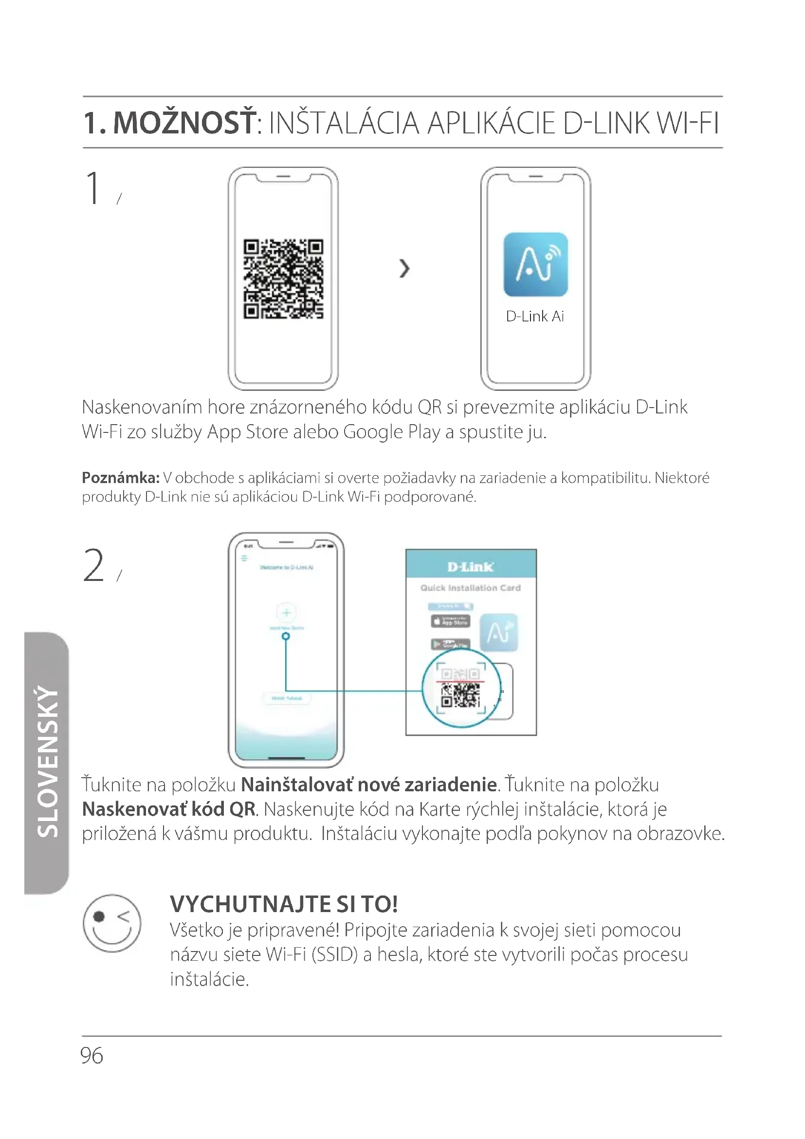 1 / Zapojte zariadenie na rozšírenie do elektrickej zásuvky v blízkosti smerovača. 2 / Počkajte, kým LED indikátor napájania na zariadení na rozšírenie nezačne blikať na oranžovo.Poznámka: Informácie o správaní LED indikátora na konkrétnom zariadení nájdete v návode na používanie daného zariadenia. < 1 m < 1 m98 SLOVENSKÝ UŽITE SI TO! Všetko je pripravené! Pripojte zariadenia k svojej sieti pomocou názvu siete Wi-Fi (SSID) a hesla, ktoré ste vytvorili počas procesu inštalácie. Do panela s adresou vo webovom prehľadávači napíšte adresu http://WXYZ.devicesetup.net/. Inštaláciu vykonajte podľa pokynov na obrazovke. 4 / 3 / Pripojte počítač k sieti Wi-Fi pomocou mena a hesla, ktoré sú vytlačené na Stručnej inštalačnej karte, prípadne na štítku na zariadení. Quick Installation Card “D-Link Ai ” dlink-xxxxConnectxxxxxxxxxxxxxxxxxxWi-Fi Name: E15-XXXXPassword: XXXXXXXX http://WXYZ.devicesetup.net/ Password:XXXXXX99 SLOVENSKÝ UMIESTNENIE Jedna oranžová palička znamená slabý signál. Kvalitu signálu vylepšíte tak, že presuniete zariadenie na rozšírenie bližšie k smerovaču. Zaistite, aby bolo zariadenie na rozšírenie umiestnené v otvorenom priestore. Uložte zariadenie na rozšírenie v dosahu smerovača. Skontrolujte, či LED indikátor na zariadení na rozšírenie svieti, aby bolo zaistené správne pripojenie. Zelené paličky znamenajú silný signál. Poznámka: Informácie o správaní LED indikátora na konkrétnom zariadení nájdete v návode na používanie daného zariadenia. < 1 m < 1 m < 1 m < 1 m100 SLOVENSKÝ