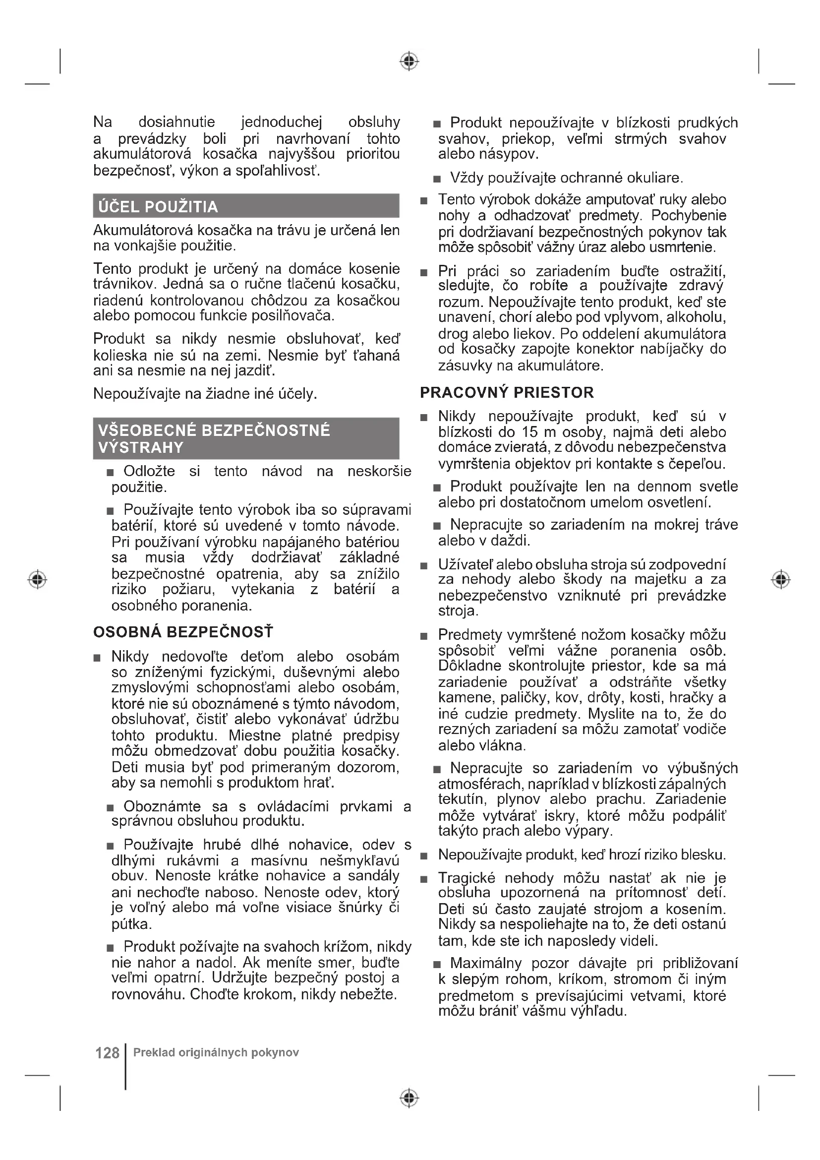 Deli ali dodatki so na prodaj ločeno Opomba Opozorilo128 Preklad originálnych pokynov Na dosiahnutie jednoduchej obsluhy a prevádzky boli pri navrhovaní tohto akumulátorová kosačka najvyššou prioritou bezpečnosť, výkon a spoľahlivosť.