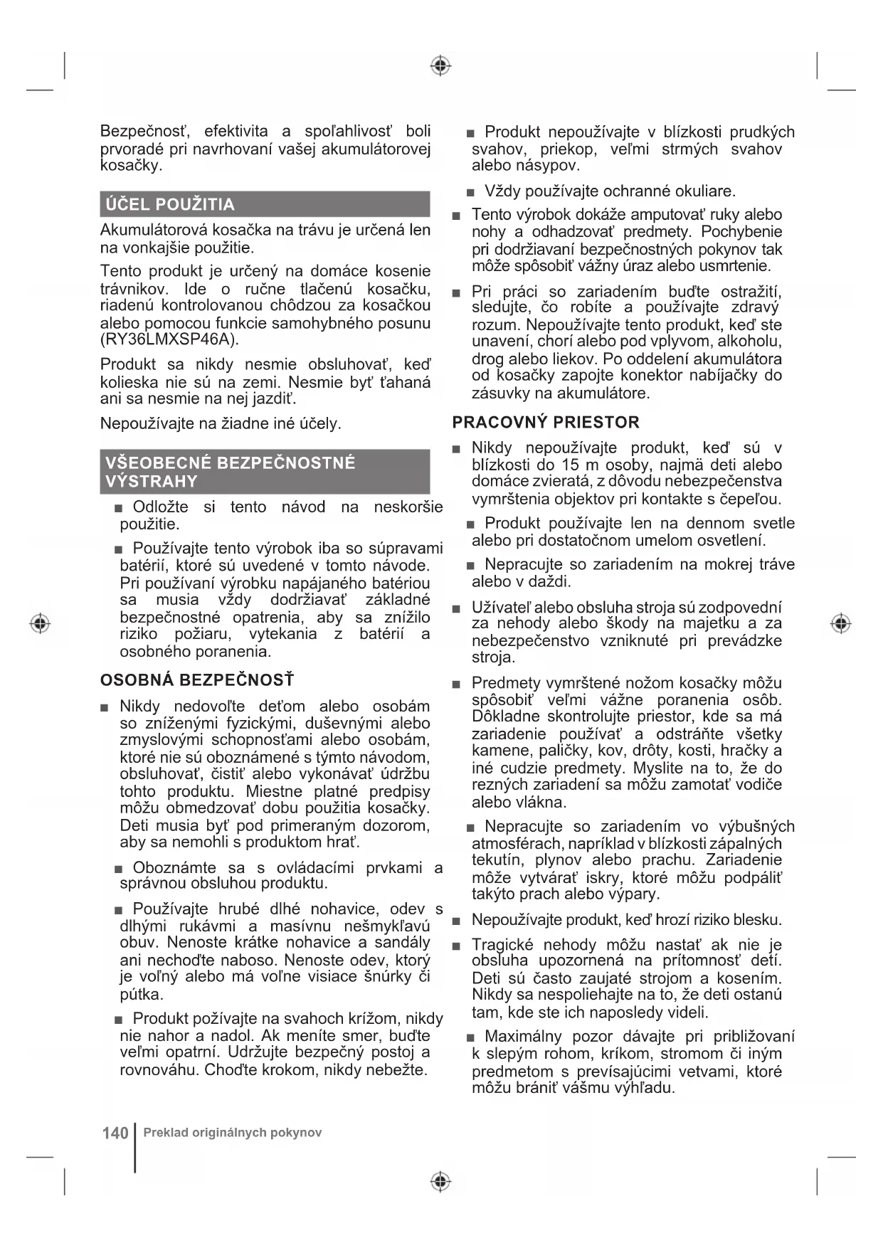 ■ Nikdy nedovoľte deťom alebo osobám so zníženými fyzickými, duševnými alebo zmyslovými schopnosťami alebo osobám, ktoré nie sú oboznámené s týmto návodom, obsluhovať, čistiť alebo vykonávať údržbu tohto produktu. Miestne platné predpisy môžu obmedzovať dobu použitia kosačky. Deti musia byť pod primeraným dozorom, aby sa nemohli s produktom hrať. ■ Oboznámte sa s ovládacími prvkami a správnou obsluhou produktu. ■ Používajte hrubé dlhé nohavice, odev s dlhými rukávmi a masívnu nešmykľavú obuv. Nenoste krátke nohavice a sandály ani nechoďte naboso. Nenoste odev, ktorý je voľný alebo má voľne visiace šnúrky či pútka. ■ Produkt požívajte na svahoch krížom, nikdy nie nahor a nadol. Ak meníte smer, buďte veľmi opatrní. Udržujte bezpečný postoj a rovnováhu. Choďte krokom, nikdy nebežte. ■ Produkt nepoužívajte v blízkosti prudkých svahov, priekop, veľmi strmých svahov alebo násypov. ■ Vždy používajte ochranné okuliare. ■ Tento výrobok dokáže amputovať ruky alebo nohy a odhadzovať predmety. Pochybenie pri dodržiavaní bezpečnostných pokynov tak môže spôsobiť vážny úraz alebo usmrtenie. ■ Pri práci so zariadením buďte ostražití, sledujte, čo robíte a používajte zdravý rozum. Nepoužívajte tento produkt, keď ste unavení, chorí alebo pod vplyvom, alkoholu, drog alebo liekov. Po oddelení akumulátora od kosačky zapojte konektor nabíjačky do zásuvky na akumulátore. PRACOVNÝ PRIESTOR ■ Nikdy nepoužívajte produkt, keď sú v blízkosti do 15 m osoby, najmä deti alebo domáce zvieratá, z dôvodu nebezpečenstva vymrštenia objektov pri kontakte s čepeľou. ■ Produkt používajte len na dennom svetle alebo pri dostatočnom umelom osvetlení. ■ Nepracujte so zariadením na mokrej tráve alebo v daždi. ■ Užívateľ alebo obsluha stroja sú zodpovední za nehody alebo škody na majetku a za nebezpečenstvo vzniknuté pri prevádzke stroja. ■ Predmety vymrštené nožom kosačky môžu spôsobiť veľmi vážne poranenia osôb. Dôkladne skontrolujte priestor, kde sa má zariadenie používať a odstráňte všetky kamene, paličky, kov, drôty, kosti, hračky a iné cudzie predmety. Myslite na to, že do rezných zariadení sa môžu zamotať vodiče alebo vlákna. ■ Nepracujte so zariadením vo výbušných atmosférach, napríklad v blízkosti zápalných tekutín, plynov alebo prachu. Zariadenie môže vytvárať iskry, ktoré môžu podpáliť takýto prach alebo výpary. ■ Nepoužívajte produkt, keď hrozí riziko blesku. ■ Tragické nehody môžu nastať ak nie je obsluha upozornená na prítomnosť detí. Deti sú často zaujaté strojom a kosením. Nikdy sa nespoliehajte na to, že deti ostanú tam, kde ste ich naposledy videli. ■ Maximálny pozor dávajte pri približovaní k slepým rohom, kríkom, stromom či iným predmetom s prevísajúcimi vetvami, ktoré môžu brániť vášmu výhľadu.SLOVENČINA