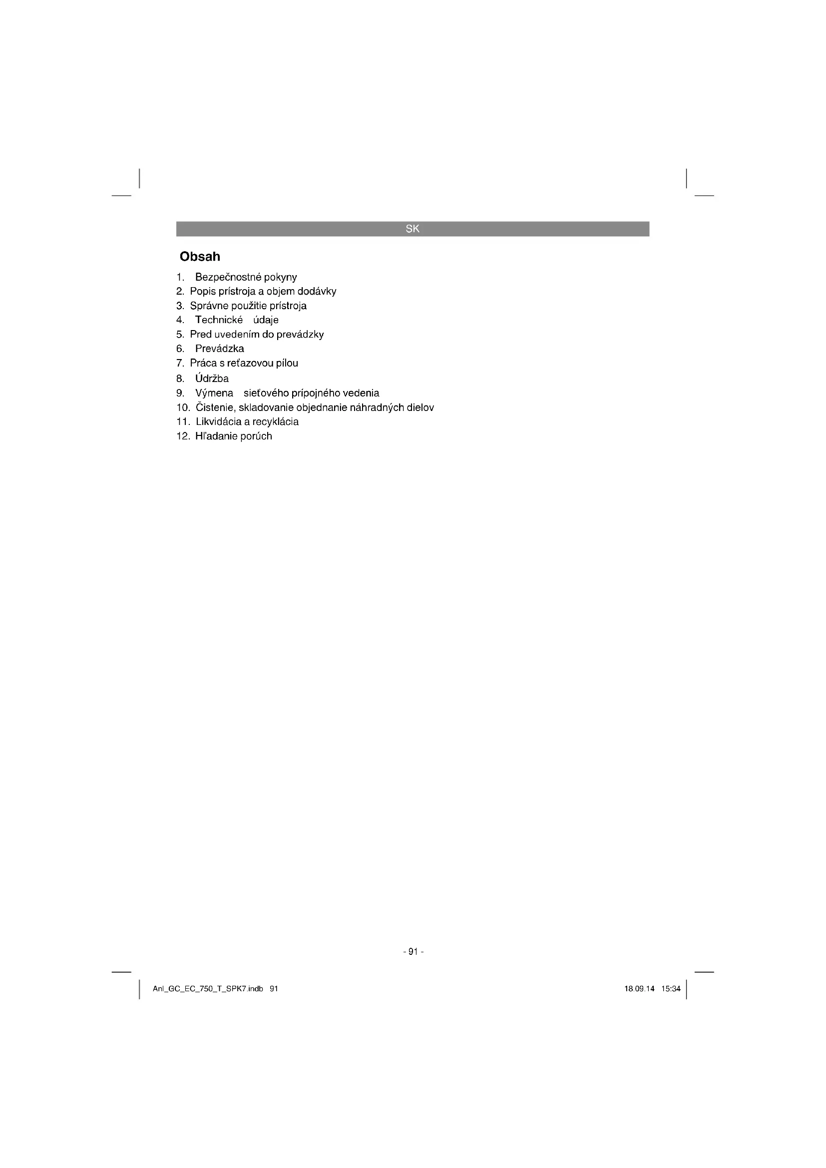 Príprava Pred každým použitím a v prípade podozrenia na poškodenie skontrolujte nasledovné body, aby ste mohli pracovať bezpečne: Stav reťazovej píly Pred začatím práce skontroluje reťazovú pílu, či sa nenachádzajú poškodenia na kryte, sieťovom kábli, pílovej reťazi alebo lište. Nikdy nespúšťajte do prevádzky zjavne poškodený prístroj. - Nebezpečenstvo úrazu! Nebezpečenstvo! Ochranné zariadenia nesmú byť odstránené ani modifi kované. - Nebezpečenstvo úrazu! Nepoužívajte pílu v tom prípade, ak ochranné zariadenia nefungujú bezchybne. Nepokúšajte sa sami opravovať bezpečnostné ochranné zariadenia, ale obráťte sa na náš servis alebo na podobne kvalifi kovanú odbornú dielňu. Používajte len príslušenstvo a náhradné diely schválené výrobcom. Inak hrozí Anl_GC_EC_750_T_SPK7.indb 95Anl_GC_EC_750_T_SPK7.indb 95 18.09.14 15:3418.09.14 15:34SK
