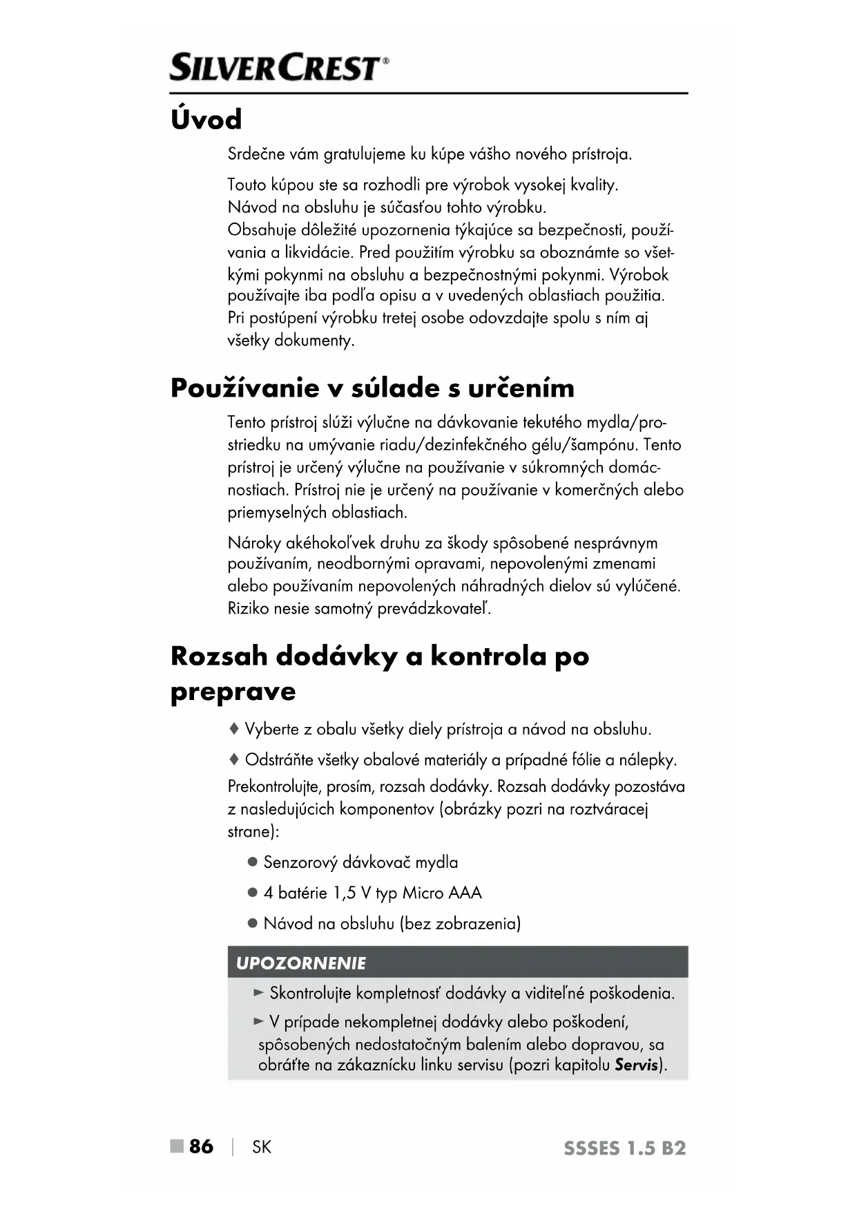 SK SSSES 1.5 B2 Úvod Srdečne vám gratulujeme ku kúpe vášho nového prístroja. Touto kúpou ste sa rozhodli pre výrobok vysokej kvality. Návod naobsluhu je súčasťou tohto výrobku. Obsahuje dôležité upozornenia týkajúce sa bezpečnosti, použí- vania a likvidácie. Pred použitím výrobku sa oboznámte sovšet- kými pokynmi na obsluhu a bezpečnostnými pokynmi. Výrobok používajte iba podľa opisu a vuvedených oblastiach použitia. Pri postúpení výrobku tretej osobe odovzdajte spolu sním aj všetky dokumenty. Používanie vsúlade surčením Tento prístroj slúži výlučne na dávkovanie tekutého mydla/pro- striedku na umývanie riadu/dezinfekčného gélu/šampónu. Tento prístroj je určený výlučne na používanie vsúkromných domác- nostiach. Prístroj nie je určený na používanie v komerčných alebo priemyselných oblastiach. Nároky akéhokoľvek druhu za škody spôsobené nesprávnym používaním, neodbornými opravami, nepovolenými zmenami alebo používaním nepovolených náhradných dielov sú vylúčené. Riziko nesie samotný prevádzkovateľ. Rozsah dodávky akontrola po preprave ♦ Vyberte zobalu všetky diely prístroja anávod na obsluhu. ♦ Odstráňte všetky obalové materiály a prípadné fólie análepky. Prekontrolujte, prosím, rozsah dodávky. Rozsah dodávky pozostáva z nasledujúcich komponentov (obrázky pozri na roztváracej strane): ▯ Senzorový dávkovač mydla ▯ 4 batérie 1,5 V typ Micro AAA ▯ Návod na obsluhu (bez zobrazenia) UPOZORNENIE ► Skontrolujte kompletnosť dodávky aviditeľné poškodenia. ► Vprípade nekompletnej dodávky alebo poškodení, spôsobených nedostatočným balením alebo dopravou, sa obráťte na zákaznícku linku servisu (pozri kapitolu Servis).SK