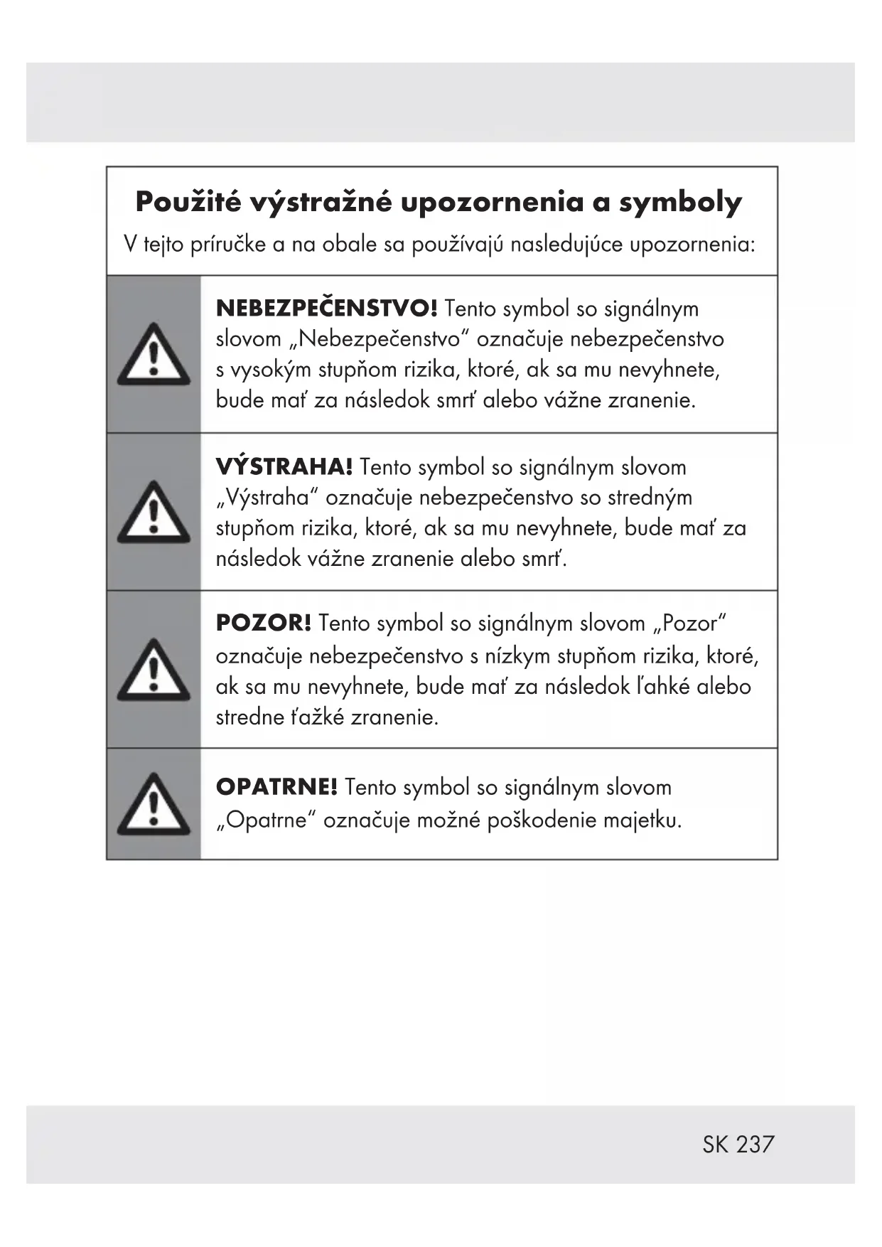 Použité výstražné upozornenia a symboly V tejto príručke a na obale sa používajú nasledujúce upozornenia: NEBEZPEČENSTVO! Tento symbol so signálnym slovom „Nebezpečenstvo“ označuje nebezpečenstvo s vysokým stupňom rizika, ktoré, ak sa mu nevyhnete, bude mať za následok smrť alebo vážne zranenie. VÝSTRAHA! Tento symbol so signálnym slovom „Výstraha“ označuje nebezpečenstvo so stredným stupňom rizika, ktoré, ak sa mu nevyhnete, bude mať za následok vážne zranenie alebo smrť. POZOR! Tento symbol so signálnym slovom „Pozor“ označuje nebezpečenstvo s nízkym stupňom rizika, ktoré, ak sa mu nevyhnete, bude mať za následok ľahké alebo stredne ťažké zranenie. OPATRNE! Tento symbol so signálnym slovom „Opatrne“ označuje možné poškodenie majetku.238