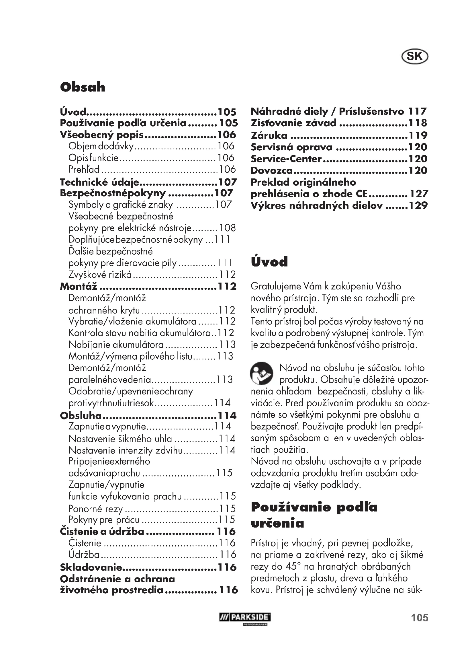 romné používanie v suchých miestnostiach. Dodržiavajte pokyny v typom pílového listu. Akékoľvek iné použitie, ktoré v tomto ná- vode na obsluhu nie je výslovne povolené, môže mať za následok poškodenie prístro- ja a predstavovať vážne nebezpečenstvo pre užívateľa. Nepoužívajte prístroj na orezávanie živých plotov alebo kríkov. Obsluhujúca osoba alebo užívateľ je zod- povedný za nehody alebo škody iných osôb alebo ich majetku. Výrobca nezodpovedá za škody, ktoré boli spôsobené používaním nezodpovedajúcim účelu použitia alebo nesprávnou obsluhou. Tento prístroj nie je vhodný na komerčné použí- vanie. Pri komerčnom použití zanikne záruka. Pri komerčnom použití zanikne záruka. Prístroj je súčasťou série X20VTEAM a môže sa prevádzkovať s akumulátormi série X20VTEAM. Akumulátory sa smú nabíjať iba s nabíjačkami série Parkside X20VTEAM. Všeobecnýpopis Obrázky najdôležitejších funkč- ných dielov nájdete na prednej a zadnej sklápacej strane. Objemdodávky Vybaľte nástroj a skontrolujte, či je kompletný: