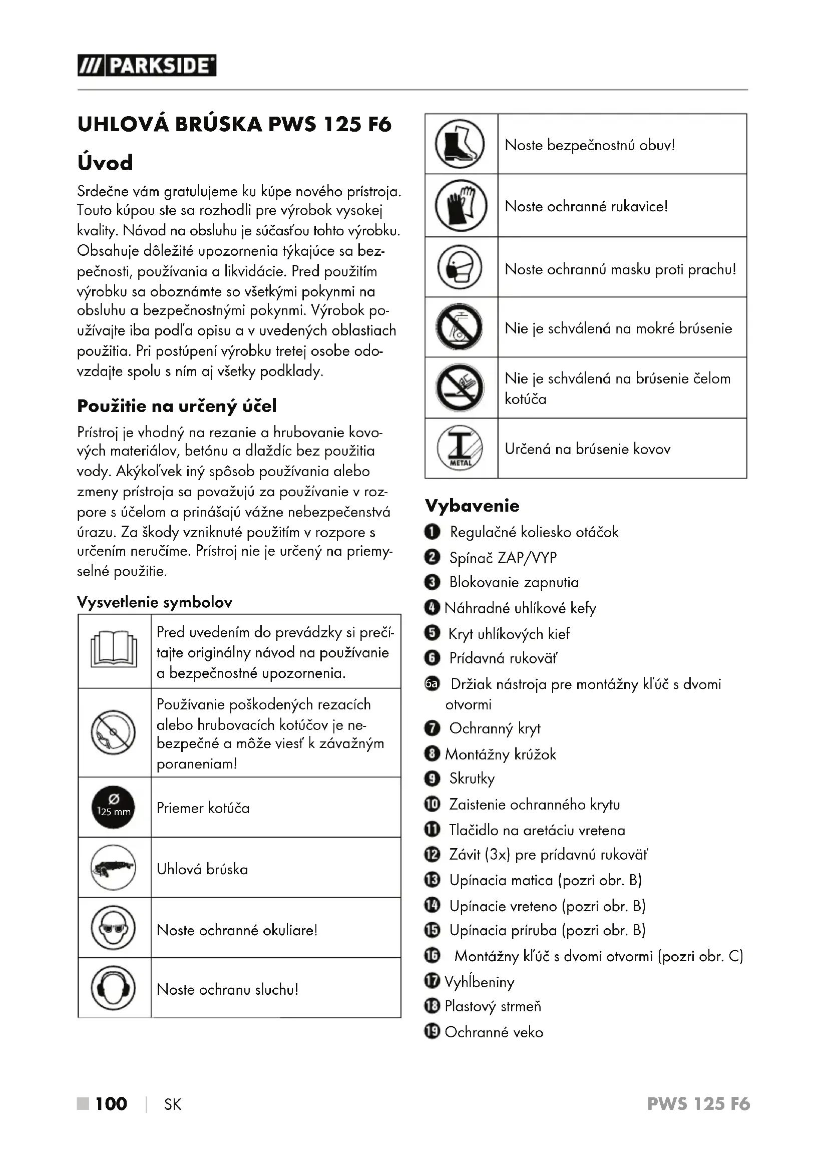 Úvod Srdečne vám gratulujeme kukúpe nového prístroja. Touto kúpou ste sa rozhodli pre výrobok vysokej kvality. Návod na obsluhu je súčasťou tohto výrobku. Obsahuje dôležité upozornenia týkajúce sa bez- pečnosti, používania a likvidácie. Pred použitím výrobku sa oboznámte sovšetkými pokynmi na obsluhu a bezpečnostnými pokynmi. Výrobok po- užívajte iba podľa opisu a vuvedených oblastiach použitia. Pri postúpení výrobku tretej osobe odo- vzdajte spolu sním aj všetky podklady. Použitie na určený účel Prístroj je vhodný na rezanie a hrubovanie kovo- vých materiálov, betónu a dlaždíc bez použitia vody. Akýkoľvek iný spôsob používania alebo zmeny prístroja sa považujú za používanie v roz- pore súčelom a prinášajú vážne nebezpečenstvá úrazu. Za škody vzniknuté použitím v rozpore s určením neručíme. Prístroj nie je určený na priemy- selné použitie. Vysvetlenie symbolov Pred uvedením do prevádzky si prečí- tajte originálny návod na používanie a bezpečnostné upozornenia. Používanie poškodených rezacích alebo hrubovacích kotúčov je ne- bezpečné a môže viesť k závažným poraneniam!