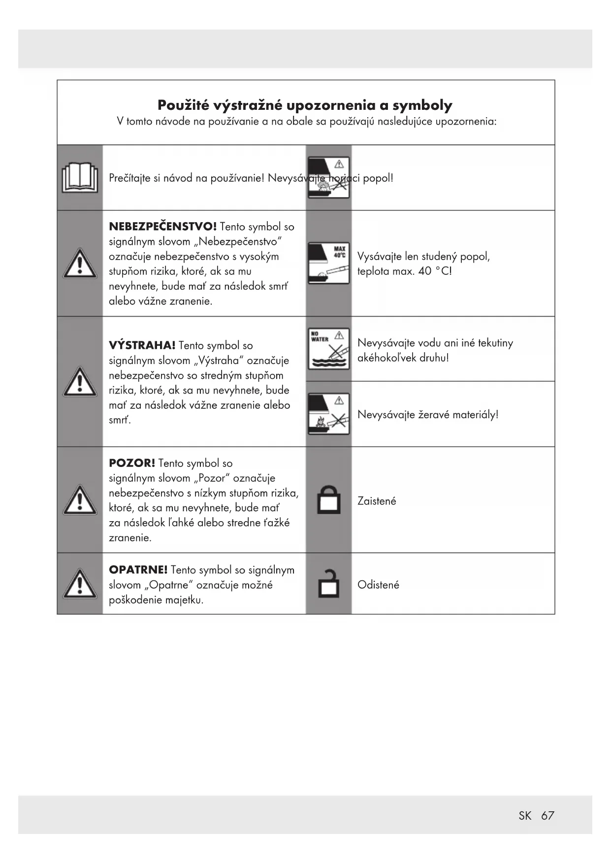 VÝSTRAHA! u Vysávajte len popol z povolených palív! Akékoľvek iné použitie alebo zmena produktu sa považujú za použitie mimo určenia a môžu spôsobiť nebezpečenstvá ako smrť, poranenie tela a poškodenie produktu. Výrobca nepreberá záruku za škody, ktoré vzniknú neodborným používaním produktu. Produkt je určený výlučne na používanie v domácnosti. Produkt nie je určený na priemyselné použitie. UPOZORNENIE u Definícia „vhodného vysávača“: – Max. prípustný príkon: 1200W – Max. prípustný objemový prietok: 1,4m