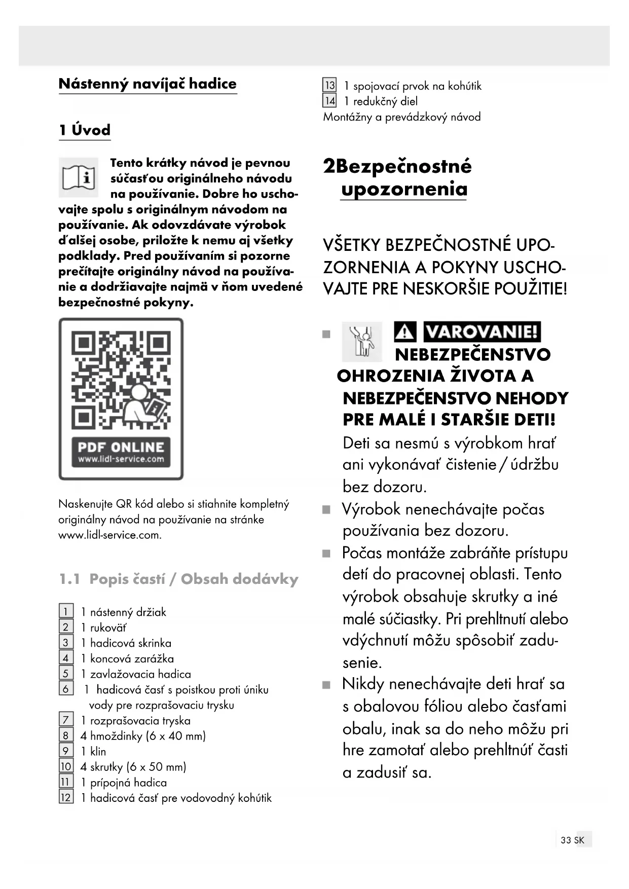 pro úsporu místa ke stěně (viz obr. B).33 SK Nástenný navíjač hadice 1 Úvod Tento krátky návod je pevnou súčasťou originálneho návodu na používanie. Dobre ho uscho- vajte spolu s originálnym návodom na používanie. Ak odovzdávate výrobok ďalšej osobe, priložte k nemu aj všetky podklady. Pred používaním si pozorne prečítajte originálny návod na používa- nie a dodržiavajte najmä v ňom uvedené bezpečnostné pokyny. Naskenujte QR kód alebo si stiahnite kompletný originálny návod na používanie na stránke www.lidl-service.com.