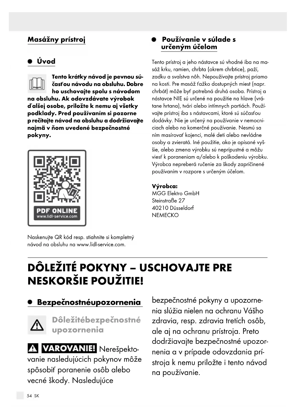 najmä v ňom uvedené bezpečnostné pokyny. Naskenujte QR kód resp. stiahnite si kompletný návod na obsluhu na www.lidl-service.com. Používanie v súlade s určeným účelom Tento prístroj a jeho nástavce sú vhodné iba na ma- sáž krku, ramien, chrbta (okrem chrbtice), paží, zadku a svalstva nôh. Nepoužívajte prístroj priamo na kosti. Pre masáž ťažko dostupných miest (napr. chrbát) môže byť potrebná druhá osoba. Prístroj a nástavce NIE sú určené na použitie na hlave (vrá- tane hrtana), tvári alebo intímnych partiách. Použí- vajte prístroj iba s nástavcami, ktoré sú súčasťou dodávky. Nie je určený na používanie v nemocni- ciach alebo na komerčné používanie. Nesmú sa ním masírovať kojenci, malé deti alebo nevládne osoby a zvieratá. Iné použitie, ako je opísané vyš- šie, alebo zmena výrobku sú neprípustné a môžu viesť k poraneniam a/alebo k poškodeniu výrobku. Výrobca nepreberá ručenie za škody zapríčinené používaním v rozpore s určeným účelom. Výrobca: MGG Elektro GmbH Steinstraße 27 40210 Düsseldorf NEMECKO
