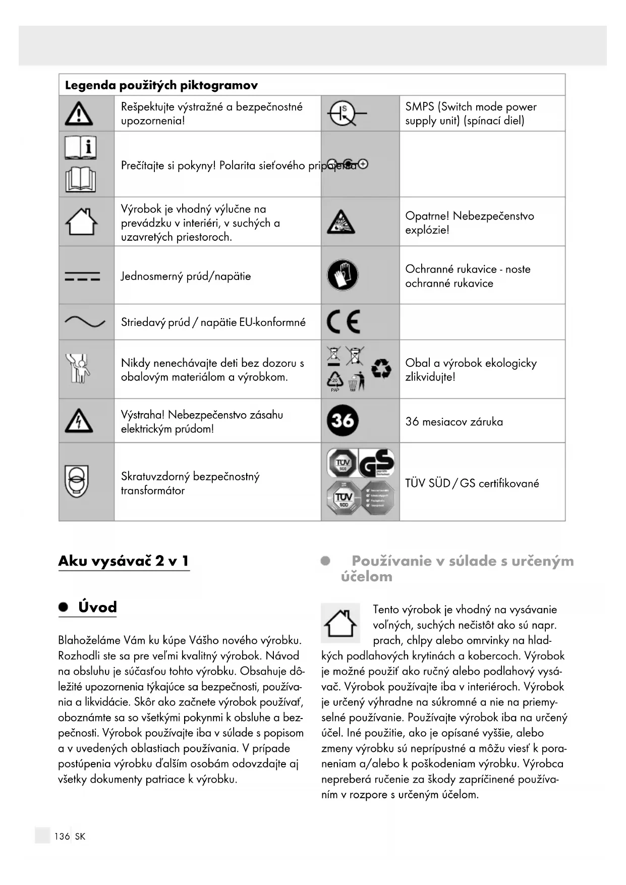 PAP Obal a výrobok ekologicky zlikvidujte! Výstraha! Nebezpečenstvo zásahu elektrickým prúdom! 36 mesiacov záruka Skratuvzdorný bezpečnostný transformátor TÜV SÜD / GS certifikované Aku vysávač 2 v 1 Úvod Blahoželáme Vám ku kúpe Vášho nového výrobku. Rozhodli ste sa pre veľmi kvalitný výrobok. Návod na obsluhu je súčasťou tohto výrobku. Obsahuje dô- ležité upozornenia týkajúce sa bezpečnosti, používa- nia a likvidácie. Skôr ako začnete výrobok používať, oboznámte sa so všetkými pokynmi k obsluhe a bez- pečnosti. Výrobok používajte iba v súlade s popisom a v uvedených oblastiach používania. V prípade postúpenia výrobku ďalším osobám odovzdajte aj všetky dokumenty patriace k výrobku. Používanie v súlade s určeným účelom Tento výrobok je vhodný na vysávanie voľných, suchých nečistôt ako sú napr. prach, chlpy alebo omrvinky na hlad- kých podlahových krytinách a kobercoch. Výrobok je možné použiť ako ručný alebo podlahový vysá- vač. Výrobok používajte iba v interiéroch. Výrobok je určený výhradne na súkromné a nie na priemy- selné používanie. Používajte výrobok iba na určený účel. Iné použitie, ako je opísané vyššie, alebo zmeny výrobku sú neprípustné a môžu viesť k pora- neniam a/alebo k poškodeniam výrobku. Výrobca nepreberá ručenie za škody zapríčinené používa- ním v rozpore s určeným účelom.137 SK Popis častí