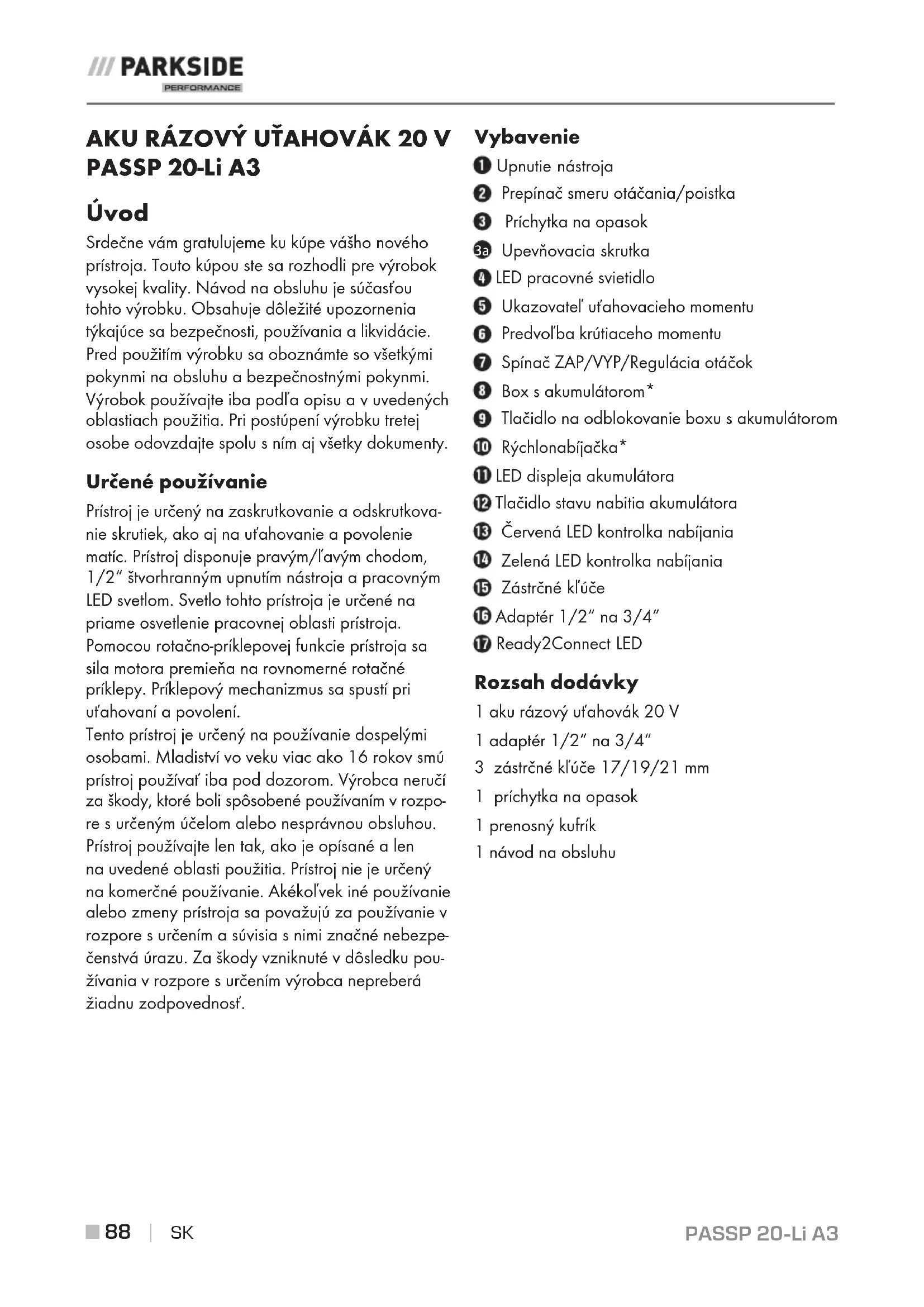 Upevňovacia skrutka LED pracovné svietidlo Ukazovateľ uťahovacieho momentu Predvoľba krútiaceho momentu Spínač ZAP/VYP/Regulácia otáčok Box s akumulátorom* Tlačidlo na odblokovanie boxu s akumulátorom Rýchlonabíjačka* LED displeja akumulátora Tlačidlo stavu nabitia akumulátora Červená LED kontrolka nabíjania Zelená LED kontrolka nabíjania Zástrčné kľúče Adaptér 1/2“ na 3/4“ Ready2Connect LED Rozsah dodávky 1 aku rázový uťahovák 20 V 1 adaptér 1/2“ na 3/4“ 3 zástrčné kľúče 17/19/21 mm 1 príchytka na opasok 1 prenosný kufrík 1 návod na obsluhuPASSP 20-Li A3 SK