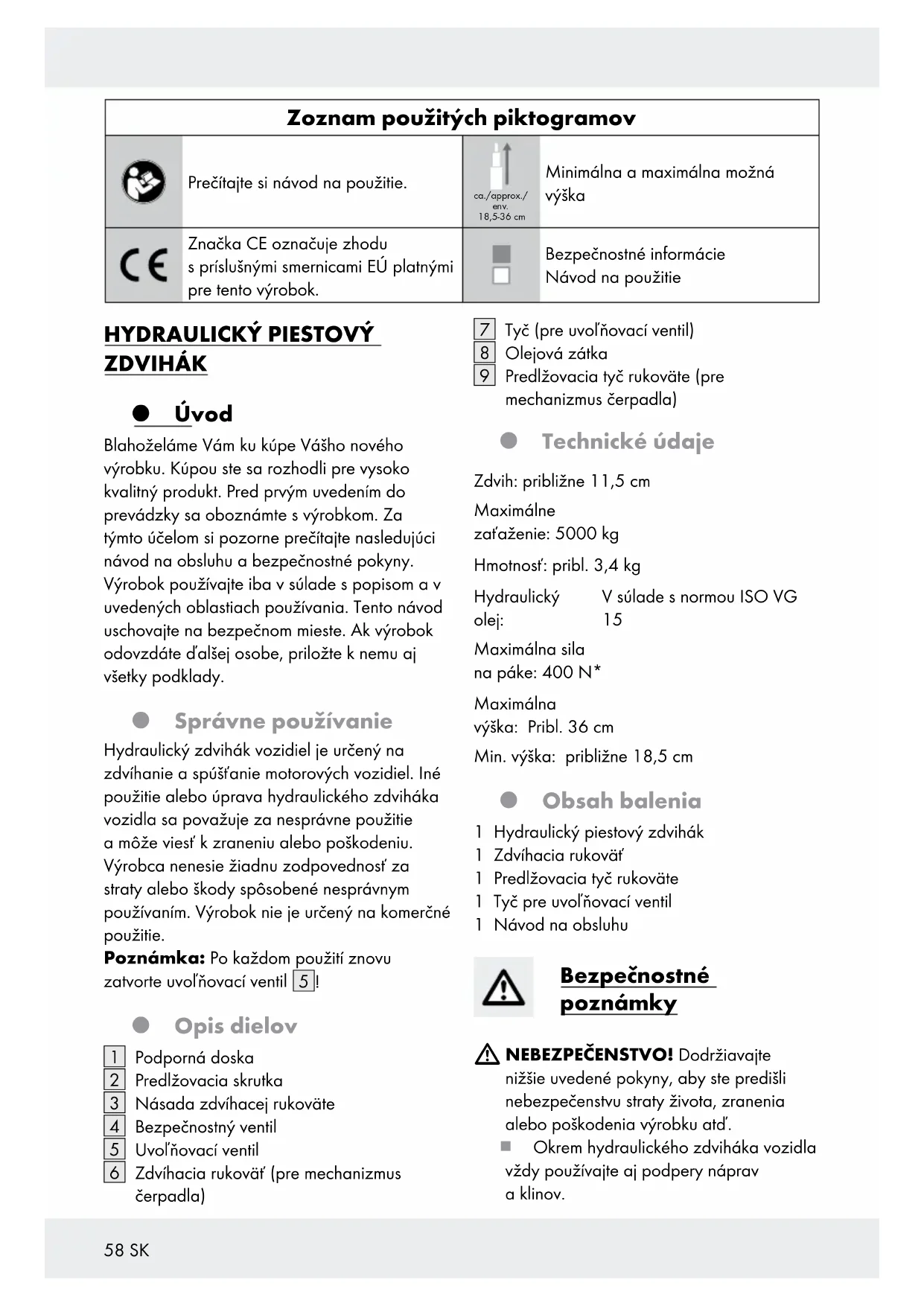 Maximálna sila na páke: 400 N* Maximálna výška: Pribl. 36 cm Min. výška: približne 18,5 cm Obsah balenia 1 Hydraulický piestový zdvihák 1 Zdvíhacia rukoväť 1 Predlžovacia tyč rukoväte 1 Tyč pre uvoľňovací ventil 1 Návod na obsluhu Bezpečnostné poznámky