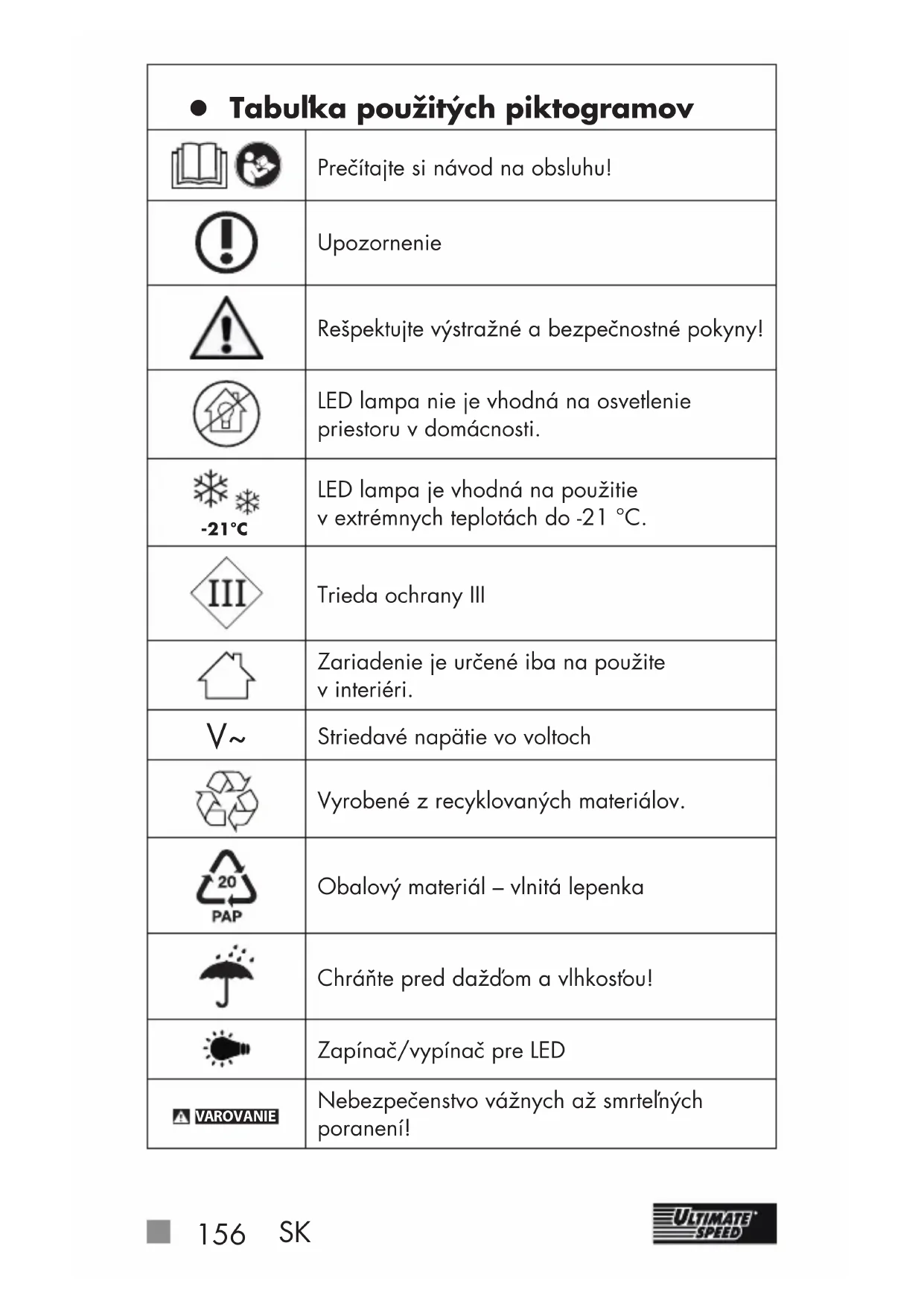 z Tabuľka použitých piktogramov Prečítajte si návod na obsluhu! Upozornenie Rešpektujte výstražné a bezpečnostné pokyny! LED lampa nie je vhodná na osvetlenie priestoru v domácnosti. -21°C LED lampa je vhodná na použitie v extrémnych teplotách do -21°C. Trieda ochrany III Zariadenie je určené iba na použite vinteriéri.