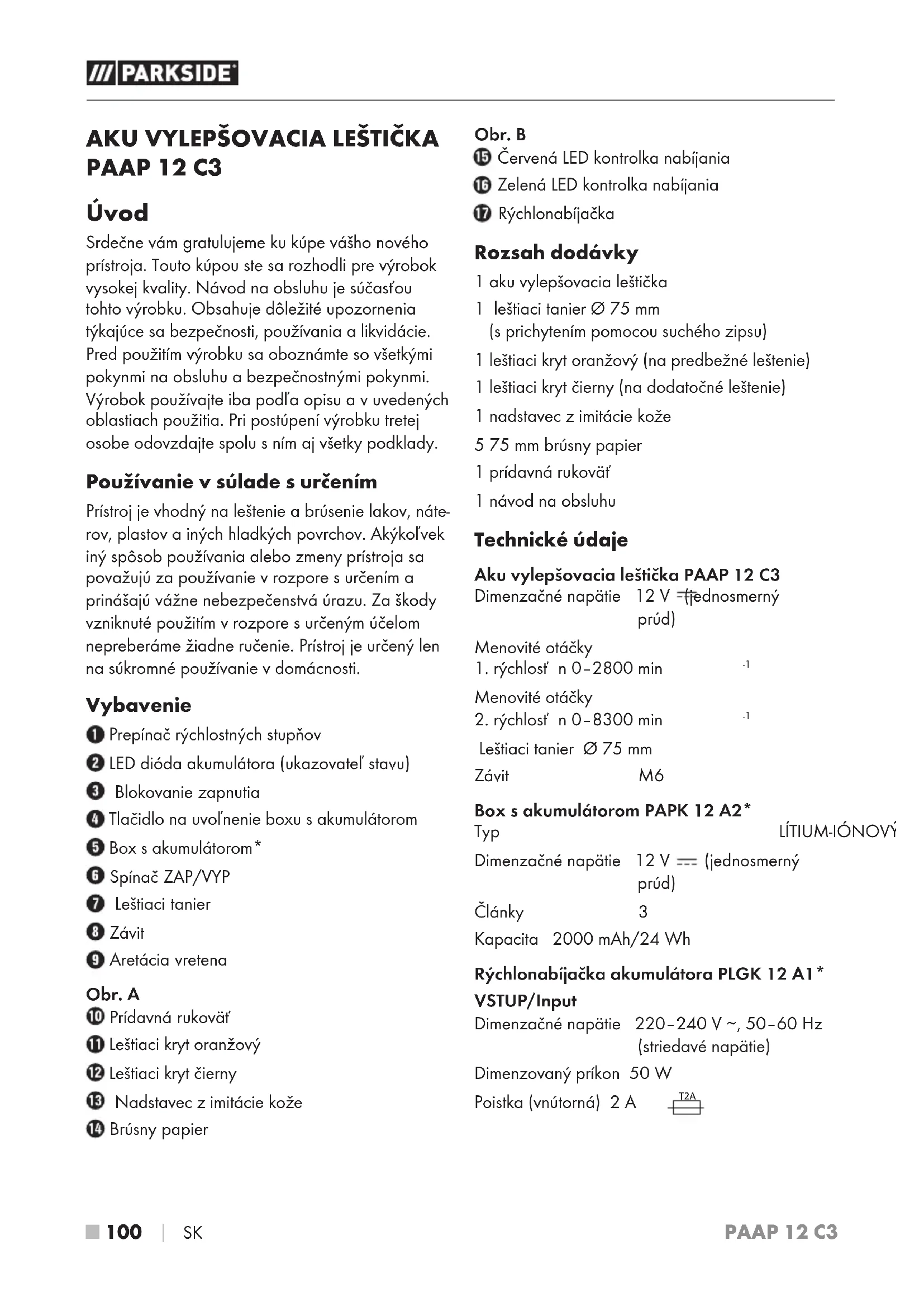 PAAP 12 C3 Úvod Srdečne vám gratulujeme kukúpe vášho nového prístroja. Touto kúpou ste sa rozhodli pre výrobok vysokej kvality. Návod na obsluhu je súčasťou tohto výrobku. Obsahuje dôležité upozornenia týkajúce sa bezpečnosti, používania a likvidácie. Pred použitím výrobku sa oboznámte sovšetkými pokynmi na obsluhu a bezpečnostnými pokynmi. Výrobok používajte iba podľa opisu a vuvedených oblastiach použitia. Pri postúpení výrobku tretej osobe odovzdajte spolu sním aj všetky podklady. Používanie vsúlade surčením Prístroj je vhodný na leštenie a brúsenie lakov, náte- rov, plastov a iných hladkých povrchov. Akýkoľvek iný spôsob používania alebo zmeny prístroja sa považujú za používanie v rozpore surčením a prinášajú vážne nebezpečenstvá úrazu. Za škody vzniknuté použitím v rozpore s určeným účelom nepreberáme žiadne ručenie. Prístroj je určený len na súkromné používanie v domácnosti. Vybavenie Prepínač rýchlostných stupňov LED dióda akumulátora (ukazovateľ stavu) Blokovanie zapnutia Tlačidlo na uvoľnenie boxu s akumulátorom Box s akumulátorom* Spínač ZAP/VYP Leštiaci tanier Závit Aretácia vretena Obr. A Prídavná rukoväť Leštiaci kryt oranžový Leštiaci kryt čierny Nadstavec z imitácie kože Brúsny papier Obr. B Červená LED kontrolka nabíjania Zelená LED kontrolka nabíjania Rýchlonabíjačka Rozsah dodávky 1 aku vylepšovacia leštička 1 leštiaci tanier Ø 75 mm (s prichytením pomocou suchého zipsu) 1 leštiaci kryt oranžový (na predbežné leštenie) 1 leštiaci kryt čierny (na dodatočné leštenie) 1 nadstavec z imitácie kože 5 75 mm brúsny papier 1 prídavná rukoväť 1 návod na obsluhu Technické údaje Aku vylepšovacia leštička PAAP 12 C3 Dimenzačné napätie 12 V (jednosmerný prúd) Menovité otáčky