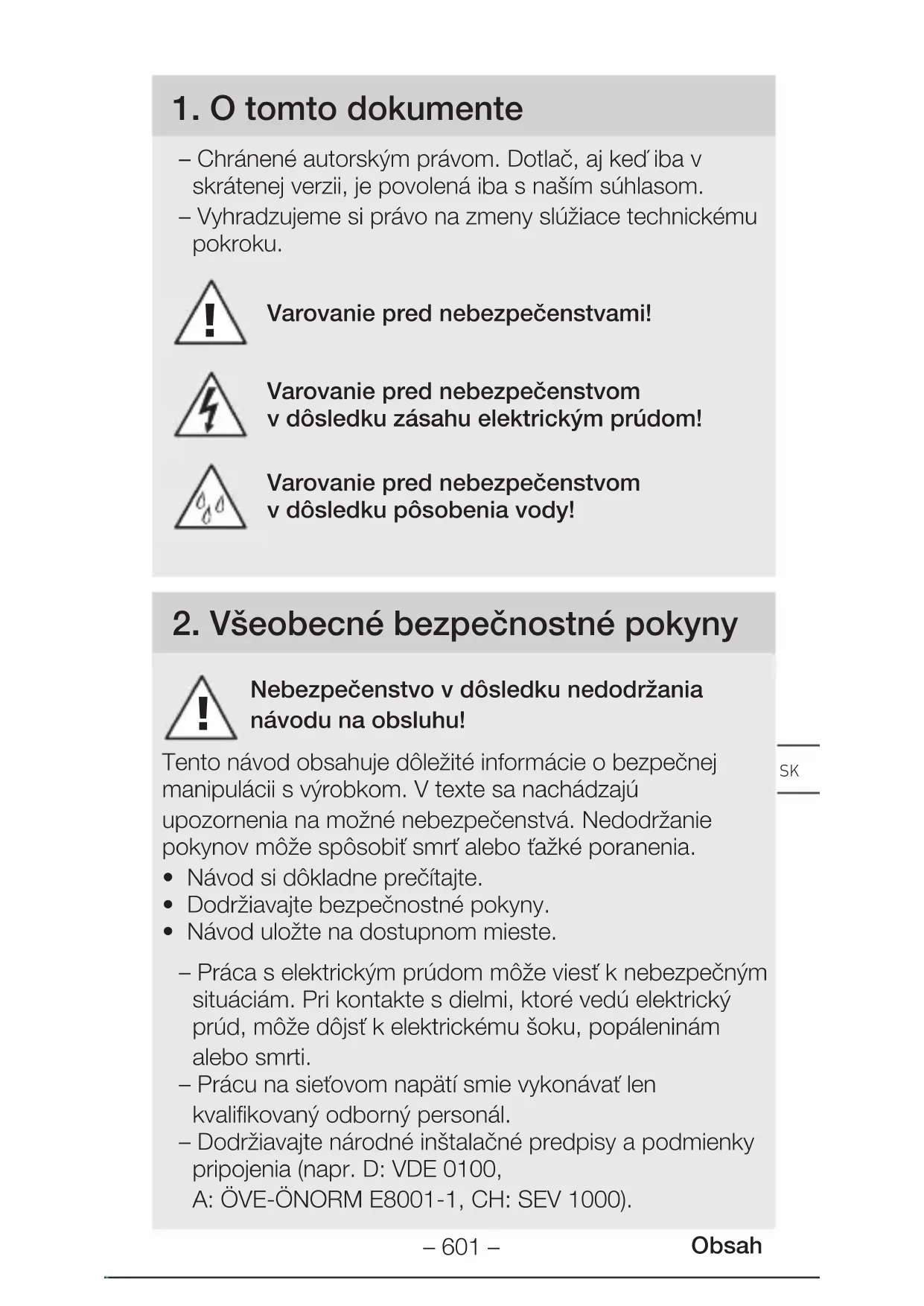 - Návod uložte na dostupnom mieste. – Práca selektrickým prúdom môže viesť knebezpečným situáciám. Pri kontakte sdielmi, ktoré vedú elektrický prúd, môže dôjsť kelektrickému šoku, popáleninám alebo smrti. – Prácu na sieťovom napätí smie vykonávať len kvalifikovaný odborný personál. – Dodržiavajte národné inštalačné predpisy a podmienky pripojenia (napr. D: VDE0100, A: ÖVE-ÖNORM E8001-1, CH:SEV1000).– 602 – Obsah – Používajte iba originálne náhradné diely. – Opravy smie vykonávať iba odborná prevádzka.