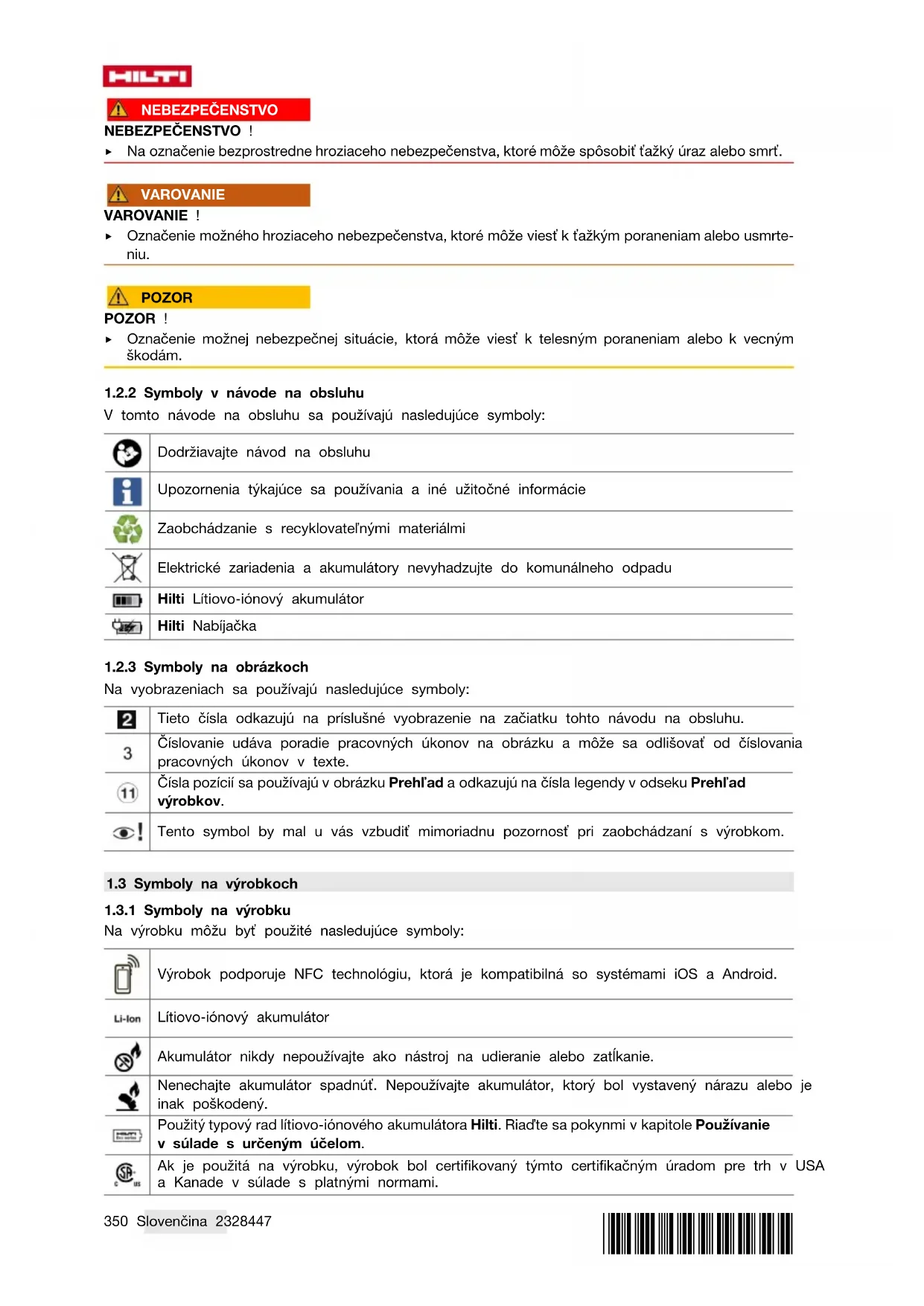 Na výrobku môžu byť použité nasledujúce symboly: Výrobok podporuje NFC technológiu, ktorá je kompatibilná so systémami iOS a Android. Lítiovo-iónový akumulátor Akumulátor nikdy nepoužívajte ako nástroj na udieranie alebo zatĺkanie. Nenechajte akumulátor spadnúť. Nepoužívajte akumulátor, ktorý bol vystavený nárazu alebo je inak poškodený. Použitý typový rad lítiovo-iónového akumulátora Hilti. Riaďte sa pokynmi v kapitole Používanie v súlade s určeným účelom. Ak je použitá na výrobku, výrobok bol certifikovaný týmto certifikačným úradom pre trh v USA a Kanade v súlade s platnými normami.*2328447* 2328447 Slovenčina 351