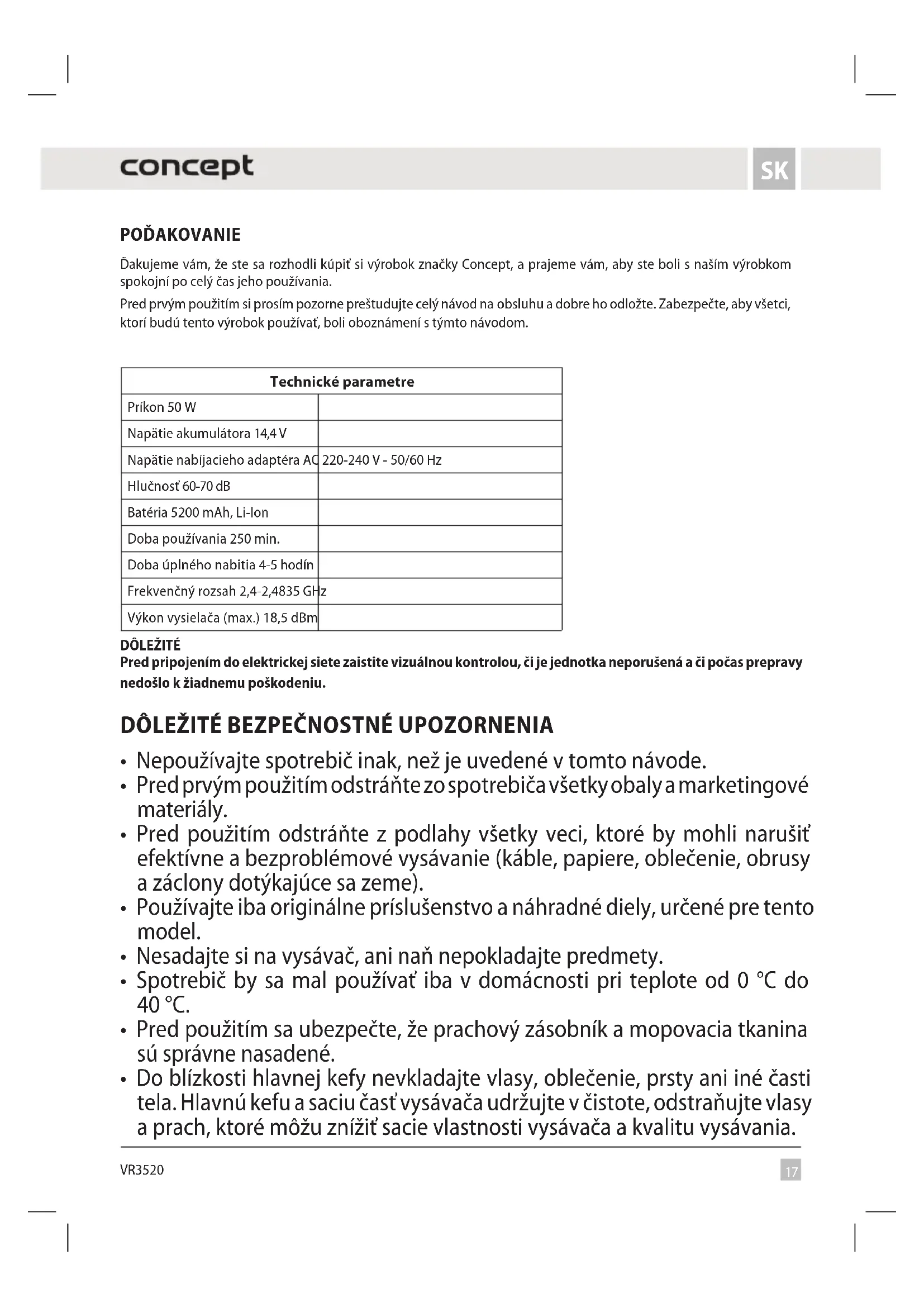 VR3520 POĎAKOVANIE Ďakujeme vám, že ste sa rozhodli kúpiť si výrobok značky Concept, a prajeme vám, aby ste boli s naším výrobkom spokojní po celý čas jeho používania. Pred prvým použitím si prosím pozorne preštudujte celý návod naobsluhu a dobre ho odložte. Zabezpečte, aby všetci, ktorí budú tento výrobok používať, boli oboznámení stýmto návodom. Technické parametre Príkon 50 W Napätie akumulátora 14,4 V Napätie nabíjacieho adaptéra AC 220-240 V - 50/60 Hz Hlučnosť 60-70 dB Batéria 5200 mAh, Li-Ion Doba používania 250 min. Doba úplného nabitia 4-5 hodín Frekvenčný rozsah 2,4-2,4835 GHz Výkon vysielača (max.) 18,5 dBm