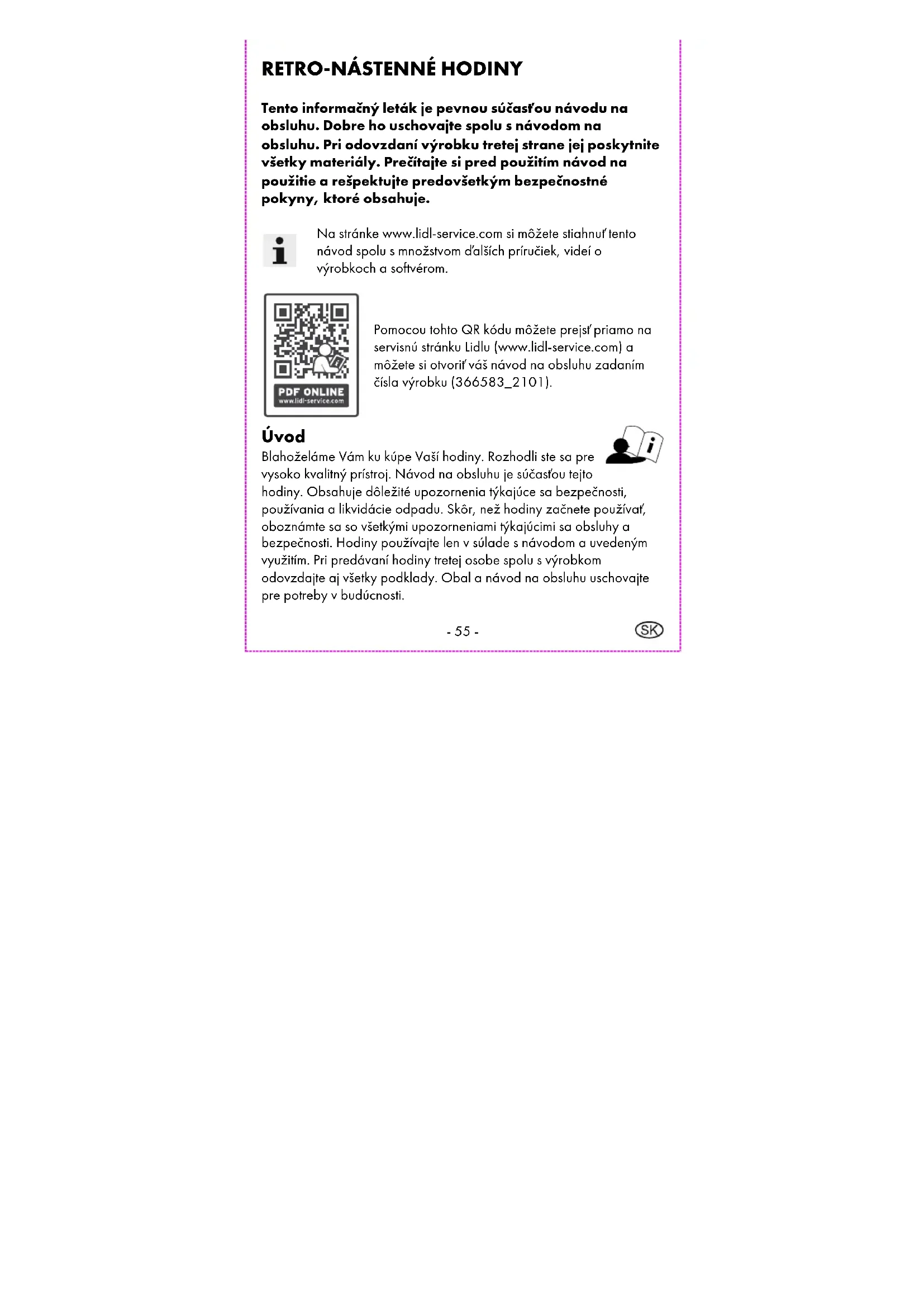Pomocou tohto QR kódu môžete prejsť priamo na servisnú stránku Lidlu (www.lidl-service.com) a môžete si otvoriť váš návod na obsluhu zadaním čísla výrobku (366583_2101). Úvod Blahoželáme Vám ku kúpe Vaší hodiny. Rozhodli ste sa pre vysoko kvalitný prístroj. Návod na obsluhu je súčasťou tejto hodiny. Obsahuje dôležité upozornenia týkajúce sa bezpečnosti, používania a likvidácie odpadu. Skôr, než hodiny začnete používať, oboznámte sa so všetkými upozorneniami týkajúcimi sa obsluhy a bezpečnosti. Hodiny používajte len v súlade s návodom a uvedeným využitím. Pri predávaní hodiny tretej osobe spolu s výrobkom odovzdajte aj všetky podklady. Obal a návod na obsluhu uschovajte pre potreby v budúcnosti.- 56 - Určené použitie Hodiny je vhodná na zobrazovanie času. Akékoľvek iné použitie alebo úpravy hodiny sa považujú za použitie v rozpore s určením. Výrobca neručí za škody vzniknuté neprípustným alebo nesprávnym používaním alebo obsluhou hodiny. Hodiny nie je určená na priemyselné použitie. Vysvetlenie znakov