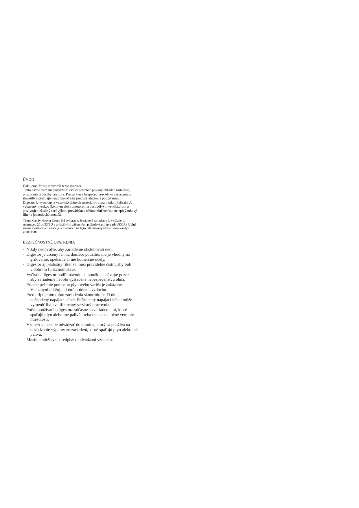 ASISTENČNÁ SLUŽBA PRE ZÁKAZNÍKOV.................................................. 11497 ÚVOD Ďakujeme, že ste si vybrali tento digestor. Tento návod vám má poskytnúť všetky potrebné pokyny ohľadne inštalácie, používania a údržby prístroja. Pre správu a bezpečnú prevádzku zariadenia si starostlivo prečítajte tento návod ešte pred inštaláciou a používaním. Digestor je vyrobený z vysokokvalitných materiálov a má moderný dizajn. Je vybavený vysokovýkonným elektromotorom a odstredivým ventilátorom a poskytuje tiež silný sací výkon, prevádzku s nízkou hlučnosťou, nelepivý tukový filter a jednoduchú montáž. Týmto Candy Hoover Group Srl vyhlasuje, že rádiové zariadenie je v súlade so smernicou 2014/53/EÚ a príslušnými zákonnými požiadavkami (pre trh UKCA). Úplné znenie vyhlásenia o zhode je k dispozícii na tejto internetovej adrese: www.candy- group.com