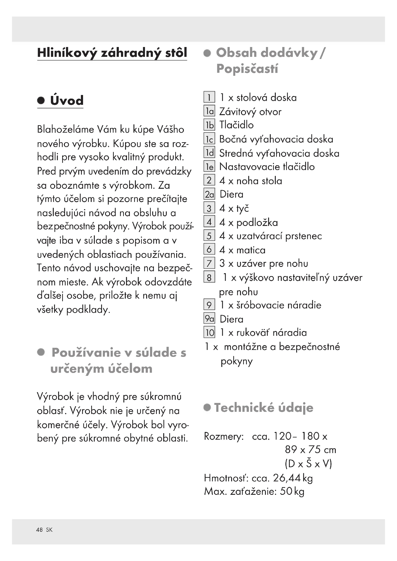 1 x rukoväť náradia 1 x montážne a bezpečnostné pokyny Technické údaje Rozmery: cca. 120– 180 x 89 x 75 cm (D x Š x V) Hmotnosť: cca. 26,44 kg Max. zaťaženie: 50 kg49 SK Bezpečnostné upozornenia
