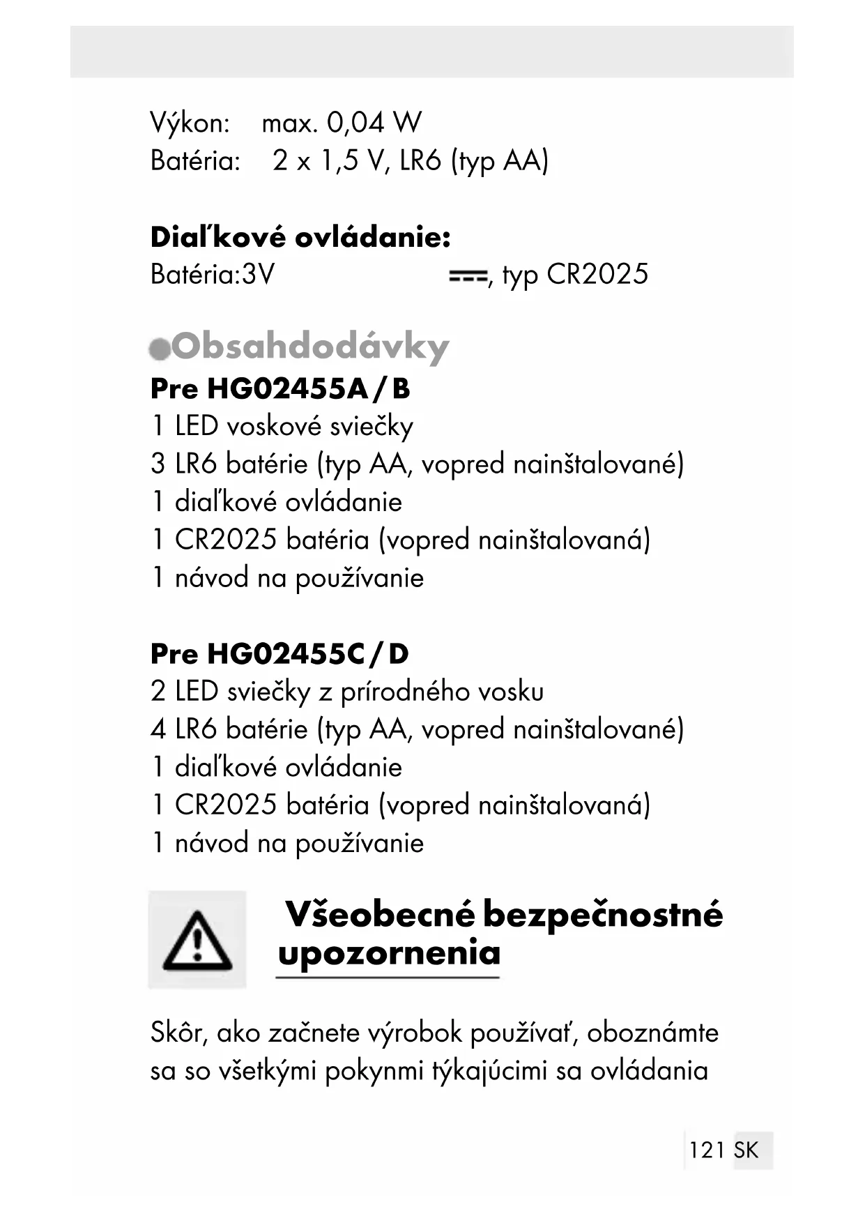 Priečinok pre batériu (diaľkové ovládanie) Technické údaje LED voskové sviečky: Pre HG02455A / B: Prevádzkové napätie: 4,5 V LED: 3 LED (LED nie je možné vymeniť.) Výkon: max. 0,3 W (HG02455A) max. 0,5 W (HG02455B) Batéria: 3 x 1,5 V, LR6 (typ AA) Pre HG02455C / D: Prevádzkové napätie: 3 V LED: 1 LED (LED nie je možné vymeniť.)121 SK Výkon: max. 0,04 W Batéria: 2 x 1,5 V, LR6 (typ AA) Diaľkové ovládanie: Batéria: 3 V , typ CR2025 Obsah dodávky Pre HG02455A / B 1 LED voskové sviečky 3 LR6 batérie (typ AA, vopred nainštalované) 1 diaľkové ovládanie 1 CR2025 batéria (vopred nainštalovaná) 1 návod na používanie Pre HG02455C / D 2 LED sviečky z prírodného vosku 4 LR6 batérie (typ AA, vopred nainštalované) 1 diaľkové ovládanie 1 CR2025 batéria (vopred nainštalovaná) 1 návod na používanie Všeobecné bezpečnostné upozornenia Skôr, ako začnete výrobok používať, oboznámte sa so všetkými pokynmi týkajúcimi sa ovládania122 SK a bezpečnosti! Pri predaní výrobku tretím oso- bám im s ním odovzdajte aj všetky podklady!