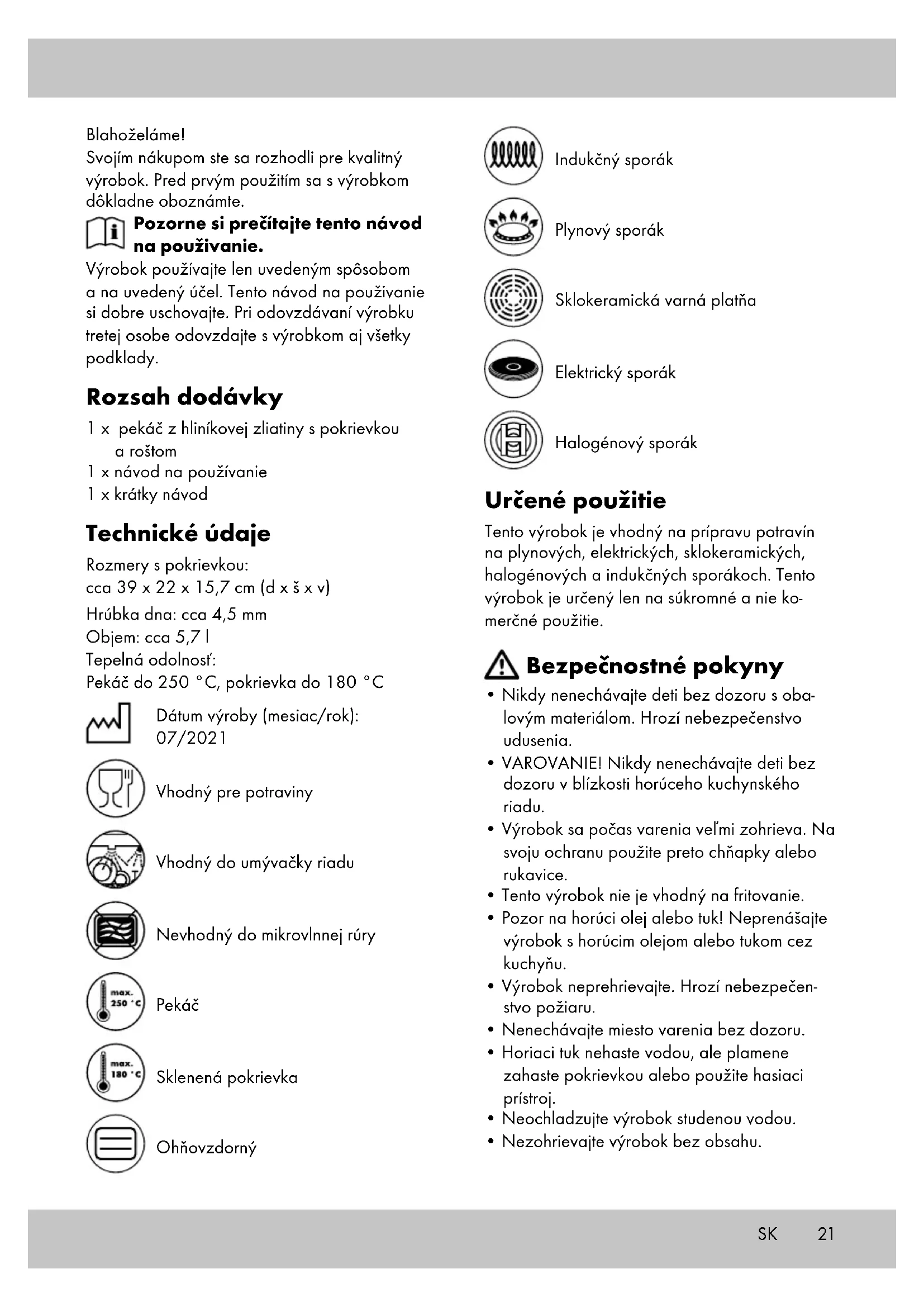 - DÔLEŽITÉ! Výrobok nikdy nečistite ostrými čistiacimi prostriedkami. Pokyny k likvidácii Výrobok a obalový materiál zlikvidujte v súlade s aktuálnymi miestnymi predpismi. Obalový materiál, ako napr. fóliové vrecúško nepatrí do rúk detí. Obalový materiál uschovajte mimo dosahu detí. Výrobky a obaly likvidujte ekologickým spôsobom. Recyklačný kód slúži na označenia rôznych materiálov na navrátenie do obehu opätovného využitia. Kód sa skladá z recyklačného symbolu - ktorý má odzrkadľovať zhodnotenie recyklačnýého obehu - a číslo označujúce materiál. Pokyny k záruke a priebehu servisu Výrobok bol vyrobený veľmi starostlivo a pod stálou kontrolou. Na tento výrobok poskytuje DELTA-SPORT HANDELSKONTOR GmbH súk- romným koncovým užívateľom trojročnú záruku odo dňa kúpy (záručná lehota) po splnení nasle- dovných podmienok. Záruka platí len na chyby materiálu a spracovania. Záruka sa netýka dielov, ktoré podliehajú bežnému opotrebeniu a preto ich možno považovať za opotrebiteľné diely (napr. batérie), ako aj krehkých dielov, napr. vypínače, akumulátory alebo diely, ktoré sú vyrobené zo skla.23 Nároky z tejto záruky zanikajú, keď sa výrobok používal neodborne alebo nesprávne, mimo určenia na používanie alebo určeného rozsahu používania alebo neboli dodržané pokyny návodu na obsluhu, s výnimkou, že koncový uží- vateľ preukáže, že ide o chybu materiálu alebo spracovania, ktorá nebola spôsobená niektorou z hore uvedených okolností. Záruku je možné uplatniť len počas záručnej lehoty po predložení originálu pokladničného dokladu. Originál pokladničného dokladu preto prosím uschovajte. Záručná doba sa kvôli prípadným záručným opravám, zákonnej záruke alebo ako obchodné gesto nepredlžuje. Platí to aj pre vymenené a opravené diely. Pri reklamáciách sa prosím najskôr obráťte na dole uvedenú Service-Hotline alebo sa s nami spojte prostredníctvom e-mailu. Ak sa jedná o záručný prípad, výrobok – podľa našej voľby – bezplatne opravíme, vymeníme alebo vrátime kúpnu cenu. Ďalšie práva zo záruky nevyplý- vajú. Vaše zákonné práva, hlavne nároky na záručné plnenie voči príslušnému predajcovi, nie sú touto zárukou obmedzené. IAN: 367895_2101 Servis Slovensko Tel.: 0850 232001 E-Mail: deltasport@lidl.sk SK24 ¡Enhorabuena! Con su compra se ha decidido por un artículo de gran calidad. Familiarícese con el artículo antes de usarlo por primera vez. Para ello, lea detenidamente las siguientes instrucciones de uso. Use el artículo solo de la forma descrita y para los campos de aplicación indicados. Conserve estas instrucciones de uso a buen recaudo. Entregue todos los documentos en caso de traspasar el artículo a terceros. Alcance de suministro 1 rustidera de aluminio fundido con tapa y rejilla 1 instrucciones de uso 1 guía rápida Datos técnicos Dimensiones con tapa: aprox. 39 x 22 x 15,7 cm (L x An x Al) Grosor de la base: aprox. 4,5 mm Capacidad: aprox. 5,7 l Resistencia al calor: Rustidera hasta 250 °C, tapa hasta 180 °C Fecha de fabricación (mes/año): 07/2021 Apto para alimentos Apto para lavavajillas No apto para microondas Rustidera Tapa de vidrio Apto para horno Cocina de inducción Cocina de gas Encimera de vitrocerámica Cocina eléctrica Cocina halógena Uso previsto Este artículo es apto para la preparación de alimentos en cocinas de gas, eléctricas, de vitro- cerámica, halógenas y de inducción. El artículo es solo para uso doméstico y no está destinado a uso comercial. Indicaciones de seguridad
