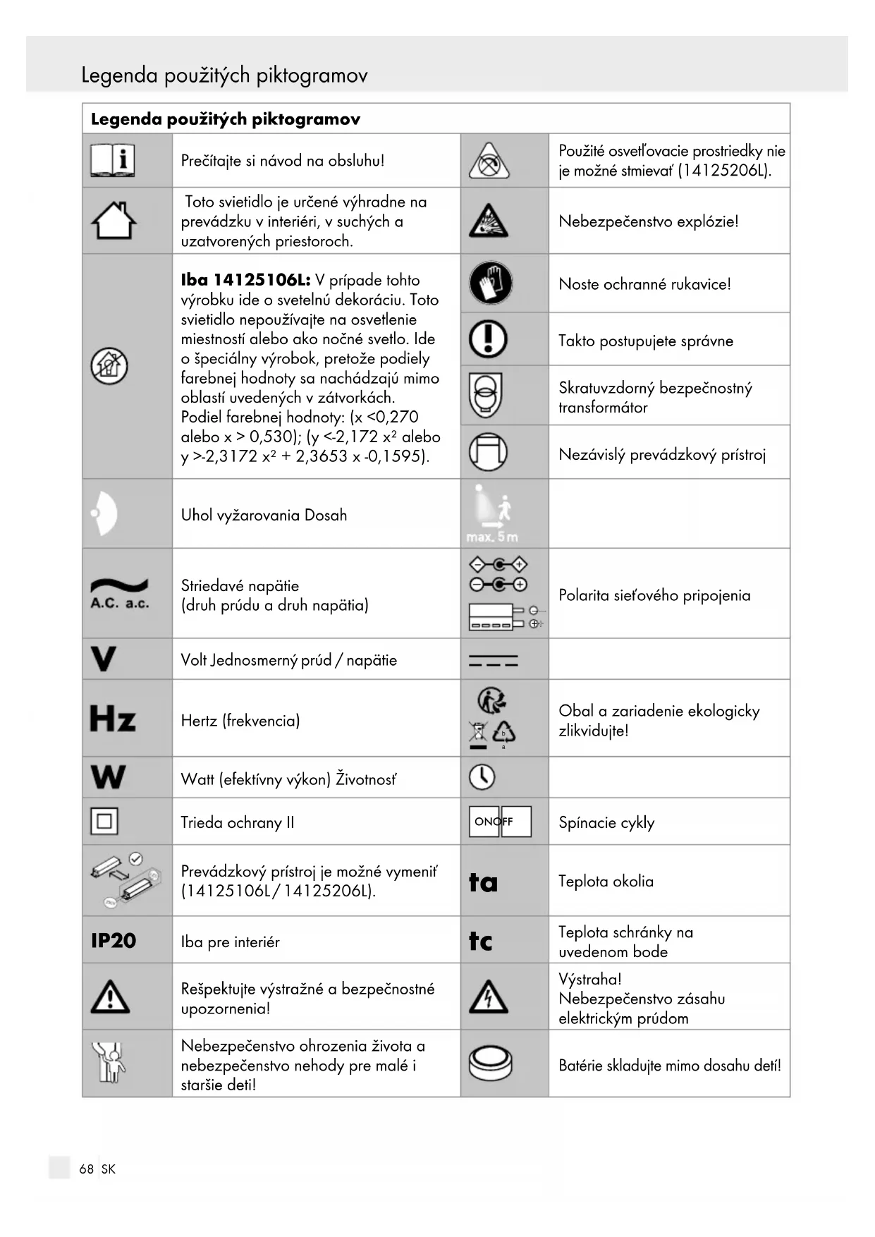 50 / 60 Hz Výstupný prúd: 0,5 A Trieda ochrany: II / Stupeň ochrany: IP20 Tento výrobok obsahuje svetelné zdroje triedy energetickej účinnosti „F“ (podľa nariadenia (EÚ) 2019/2015) (14125206L). Bezpečnosť Bezpečnostné upozornenia V prípade škôd, ktoré vzniknú nedodržiavaním tohto návodu na obsluhu, zaniká garančný nárok! Pri ná- sledných škodách nepreberá výrobca ručenie! V prípade vecných škôd alebo poranenia osôb, ktoré boli zapríčinené neodbornou manipuláciou alebo nedodržiavaním bezpečnostných pokynov, nepreberá výrobca ručenie! NEBEZPE-