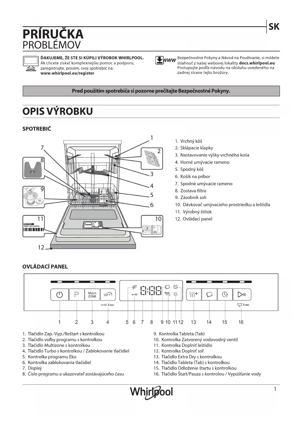 ĎAKUJEME, ŽE STE SI KÚPILI VÝROBOK WHIRLPOOL. Ak chcete získať komplexnejšiu pomoc a podporu, zaregistrujte, prosím, svoj spotrebič na: www.whirlpool.eu/registerBezpečnostné Pokyny aNávod na Používanie, si môžete stiahnuť znašej webovej lokality docs.whirlpool.eu Postupujte podľa návodu na obsluhu uvedeného na zadnej strane tejto brožúry.1. Vrchný kôš2. Sklápacie klapky3. Nastavovanie výšky vrchného koša4. Horné umývacie rameno5. Spodný kôš6. Košík na príbor7. Spodné umývacie rameno8. Zostava ltra9. Zásobník soli10. Dávkovač umývacieho prostriedku a leštidla11. Výrobný štítok12. Ovládací panel0000 000 00000 Service: