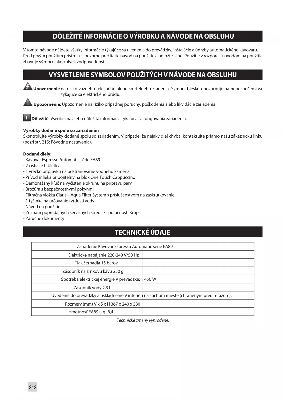 Dôležité: Všeobecná alebo dôležitá informácia týkajúca sa fungovania zariadenia. Výrobky dodané spolu so zariadením Skontrolujte výrobky dodané spolu so zariadením. V prípade, že nejaký diel chýba, kontaktujte priamo našu zákaznícku linku (pozri str. 215: Pôvodné nastavenia). Dodané diely: - Kávovar Espresso Automatic série EA89 - 2 čistiace tabletky - 1 vrecko prípravku na odstraňovanie vodného kameňa - Prívod mlieka pripojiteľný na blok One Touch Cappuccino - Demontážny kľúč na vyčistenie okruhu na prípravu pary - Brožúra s bezpečnostnými pokynmi - Filtračná vložka Claris – Aqua Filter System s príslušenstvom na zaskrutkovanie - 1 tyčinka na určovanie tvrdosti vody - Návod na použitie - Zoznam popredajných servisných stredísk spoločnosti Krups - Záručné dokumenty TECHNICKÉ ÚDAJE Zariadenie Kávovar Espresso Automatic série EA89 Elektrické napájanie 220-240 V/50 Hz Tlak čerpadla 15 barov Zásobník na zrnkovú kávu 250 g Spotreba elektrickej energie V prevádzke: 1 450 W Zásobník vody 2,3 l Uvedenie do prevádzky a uskladnenie V interiéri na suchom mieste (chráneným pred mrazom). Rozmery (mm) V x Š x H 367 x 240 x 380 Hmotnosť EA89 (kg) 8,4 Technické zmeny vyhradené.213