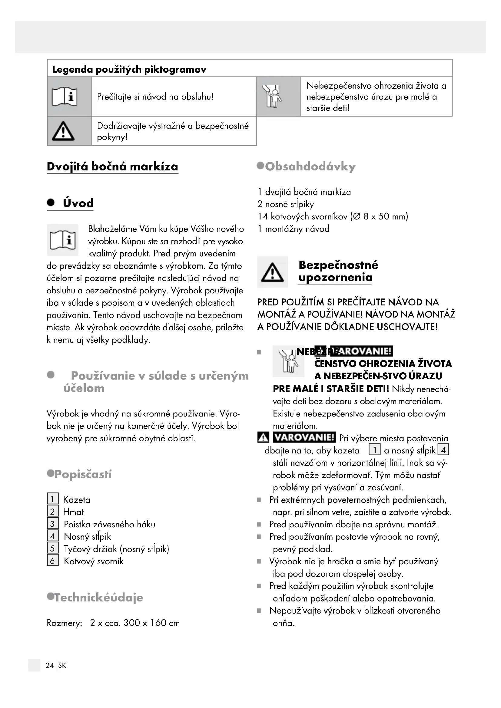 Pred používaním dbajte na správnu montáž. Pred používaním postavte výrobok na rovný, pevný podklad. Výrobok nie je hračka a smie byť používaný iba pod dozorom dospelej osoby. Pred každým použitím výrobok skontrolujte ohľadom poškodení alebo opotrebovania. Nepoužívajte výrobok v blízkosti otvoreného ohňa.25 SK Odporúčame, aby montáž výrobku vykonali dve osoby, aby nedošlo k poraneniam alebo vzniku vecných škôd na výrobku. Nepustite rukoväť