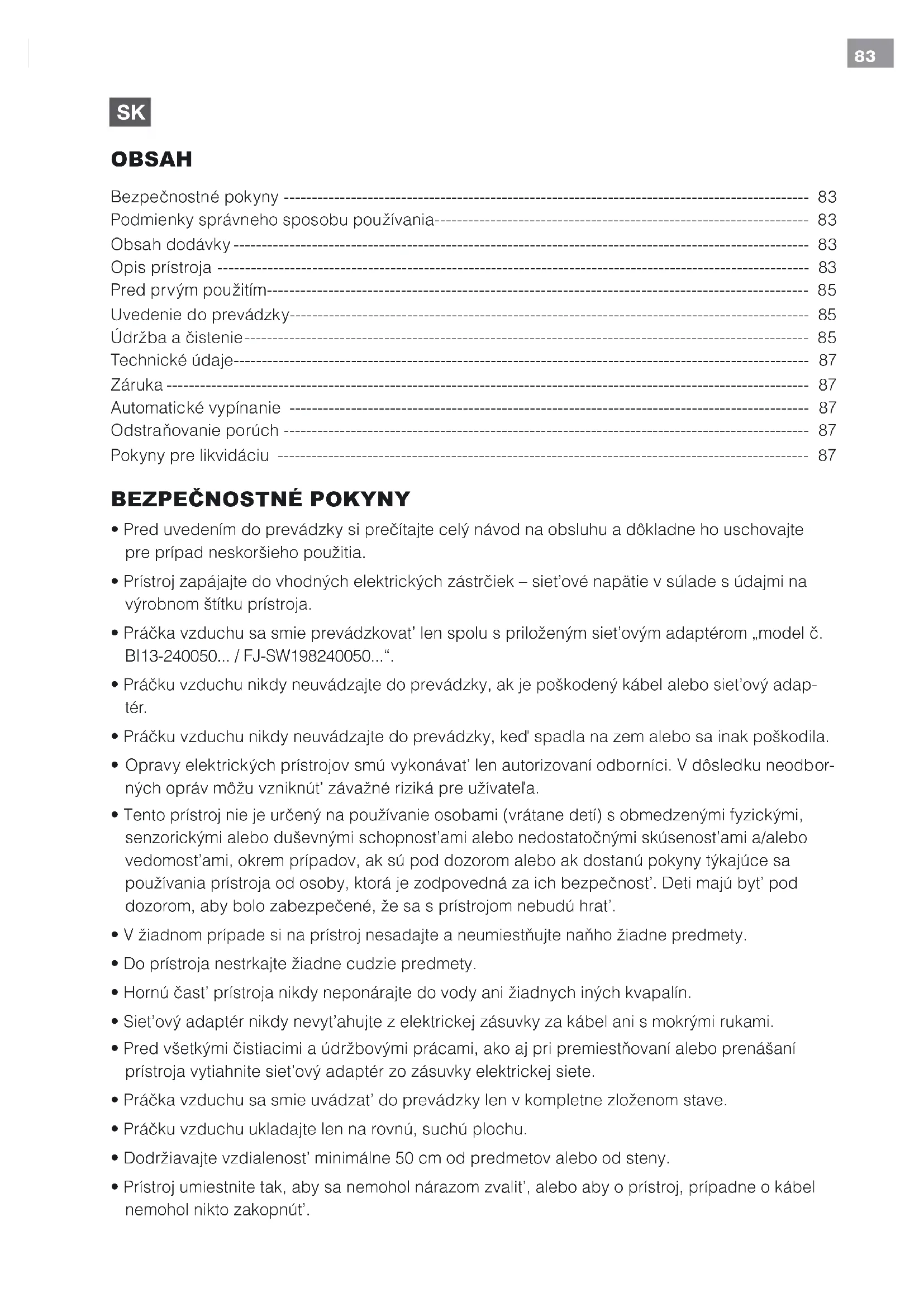 - Práčku vzduchu nikdy neuvádzajte do prevádzky, ak je poškodený kábel alebo sieťový adap- tér.