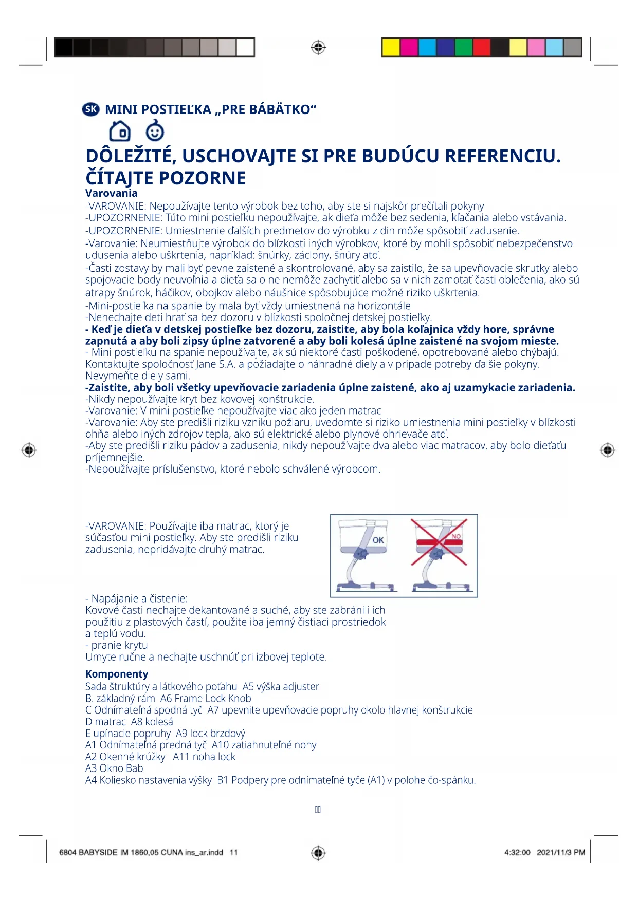 MINI POSTIEĽKA „PRE BÁBÄTKO“ DÔLEŽITÉ, USCHOVAJTE SI PRE BUDÚCU REFERENCIU. ČÍTAJTE POZORNE Varovania -VAROVANIE: Nepoužívajte tento výrobok bez toho, aby ste si najskôr prečítali pokyny -UPOZORNENIE: Túto mini postieľku nepoužívajte, ak dieťa môže bez sedenia, kľačania alebo vstávania. -UPOZORNENIE: Umiestnenie ďalších predmetov do výrobku z din môže spôsobiť zadusenie. -Varovanie: Neumiestňujte výrobok do blízkosti iných výrobkov, ktoré by mohli spôsobiť nebezpečenstvo udusenia alebo uškrtenia, napríklad: šnúrky, záclony, šnúry atď. -Časti zostavy by mali byť pevne zaistené a skontrolované, aby sa zaistilo, že sa upevňovacie skrutky alebo spojovacie body neuvoľnia a dieťa sa o ne nemôže zachytiť alebo sa v nich zamotať časti oblečenia, ako sú atrapy šnúrok, háčikov, obojkov alebo náušnice spôsobujúce možné riziko uškrtenia. -Mini-postieľka na spanie by mala byť vždy umiestnená na horizontále -Nenechajte deti hrať sa bez dozoru v blízkosti spoločnej detskej postieľky. - Keď je dieťa v detskej postieľke bez dozoru, zaistite, aby bola koľajnica vždy hore, správne zapnutá a aby boli zipsy úplne zatvorené a aby boli kolesá úplne zaistené na svojom mieste. - Mini postieľku na spanie nepoužívajte, ak sú niektoré časti poškodené, opotrebované alebo chýbajú. Kontaktujte spoločnosť Jane S.A. a požiadajte o náhradné diely a v prípade potreby ďalšie pokyny. Nevymeňte diely sami. -Zaistite, aby boli všetky upevňovacie zariadenia úplne zaistené, ako aj uzamykacie zariadenia. -Nikdy nepoužívajte kryt bez kovovej konštrukcie. -Varovanie: V mini postieľke nepoužívajte viac ako jeden matrac -Varovanie: Aby ste predišli riziku vzniku požiaru, uvedomte si riziko umiestnenia mini postieľky v blízkosti ohňa alebo iných zdrojov tepla, ako sú elektrické alebo plynové ohrievače atď. -Aby ste predišli riziku pádov a zadusenia, nikdy nepoužívajte dva alebo viac matracov, aby bolo dieťaťu príjemnejšie. -Nepoužívajte príslušenstvo, ktoré nebolo schválené výrobcom. -VAROVANIE: Používajte iba matrac, ktorý je súčasťou mini postieľky. Aby ste predišli riziku zadusenia, nepridávajte druhý matrac. - Napájanie a čistenie: Kovové časti nechajte dekantované a suché, aby ste zabránili ich použitiu z plastových častí, použite iba jemný čistiaci prostriedok a teplú vodu. - pranie krytu Umyte ručne a nechajte uschnúť pri izbovej teplote. Komponenty Sada štruktúry a látkového poťahu A5 výška adjuster B. základný rám A6 Frame Lock Knob C Odnímateľná spodná tyč A7 upevnite upevňovacie popruhy okolo hlavnej konštrukcie D matrac A8 kolesá E upínacie popruhy A9 lock brzdový A1 Odnímateľná predná tyč A10 zatiahnuteľné nohy A2 Okenné krúžky A11 noha lock A3 Okno Bab A4 Koliesko nastavenia výšky B1 Podpery pre odnímateľné tyče (A1) v polohe čo-spánku. Skontrolujte, či 2 plastové podpery aab smerujú nahor Inštrukcie Zostavenie a rozloženie Mini-postieľky na spanie. - Na zostavenie detskej postieľky položte horný rám s krytom na čistý stôl alebo na posteľ podľa obrázku 2. - Vždy umiestnite každú z bočných nôh s číslovaním výšky na vonkajšej strane a koniec každej nohy vložte do bočných podperiek z plastu a kovový kolík vyjde cez otvor (zacvakne) a plastové bočné nohy sa zasuňte do zapuzdrených otvorov. - Musíte počuť mapy zabezpečenia. - Nasaďte dlhú tyč zasunutím každého konca do plastových drážok, kým kovový kolík nezapadne späť. Mali by ste počuť bezpečnostné kliknutia. Potom umiestnite konštrukciu s kolesami na podlahu. -Nakoniec umiestnite spodný rám a bočné konce zarovnajte s otvormi do polovice bokov mini postieľky a potom úplne zasuňte každý koniec dovnútra, kým bezpečne nezapadne. - Vezmite popruh z hodvábnej tkaniny a zakryte bočnú hliníkovú podperu, aby sa popruh otáčal k druhej časti na suchý zips, z mini postieľky zatlačte na suchý zips časti k sebe. Zaistite horný suchý zips suchým zipsom, ktorý nájdete pod tkaninou. Demontáž mini postieľky: Demontujte mini postieľku, postupujte podľa vyššie uvedených krokov dozadu, kým sa 3 bloky na oboch stranách neuvoľnia jednou rukou stlačením kovového kolíka (1) a druhou stlačením dvoch plastových nožičiek (2, 3) a potom nohu (4) vyberte. . Potom, čo je základný rám zostavený, obloženie pasuje pripevnením suchých zipsov (4) nachádzajúcich sa na spodnej časti obloženia (4) k rúrke základného rámu. Položte matrac na spodok mini-postieľky. Mini postieľku používajte bez matraca BabyKant. Uzamknite všetky štyri kolesá detskej postieľky Co-Sleeping, spustením páčok ich zaistite, aby bolo na kolesách úplne viditeľné červené číslo. Používajte ako postieľku (de meest uitgebreide positie) (*)Dôležité: Pred použitím ako mini kolísky do postieľky sa uistite, že teleskopické nohy sú vždy rozložené a v čo najroztiahnutejšej polohe (1) Mini postieľka je teraz pripravená na použitie. Pri rozkladaní mini-postieľky na spanie postupujte podľa rovnakých krokov naopak. Rozloženie a sklopenie nohy (poloha spoločného spánku) Palcom zasuňte kryt dozadu a podržte tlačidlo, nohu zatlačte druhou rukou, aby sa zmestila do postele, keď ju zložíte alebo oddelíte od postele, automaticky sa vráti do pôvodnej polohy v rozloženej polohe. kde sa automaticky nastaví na mieste.