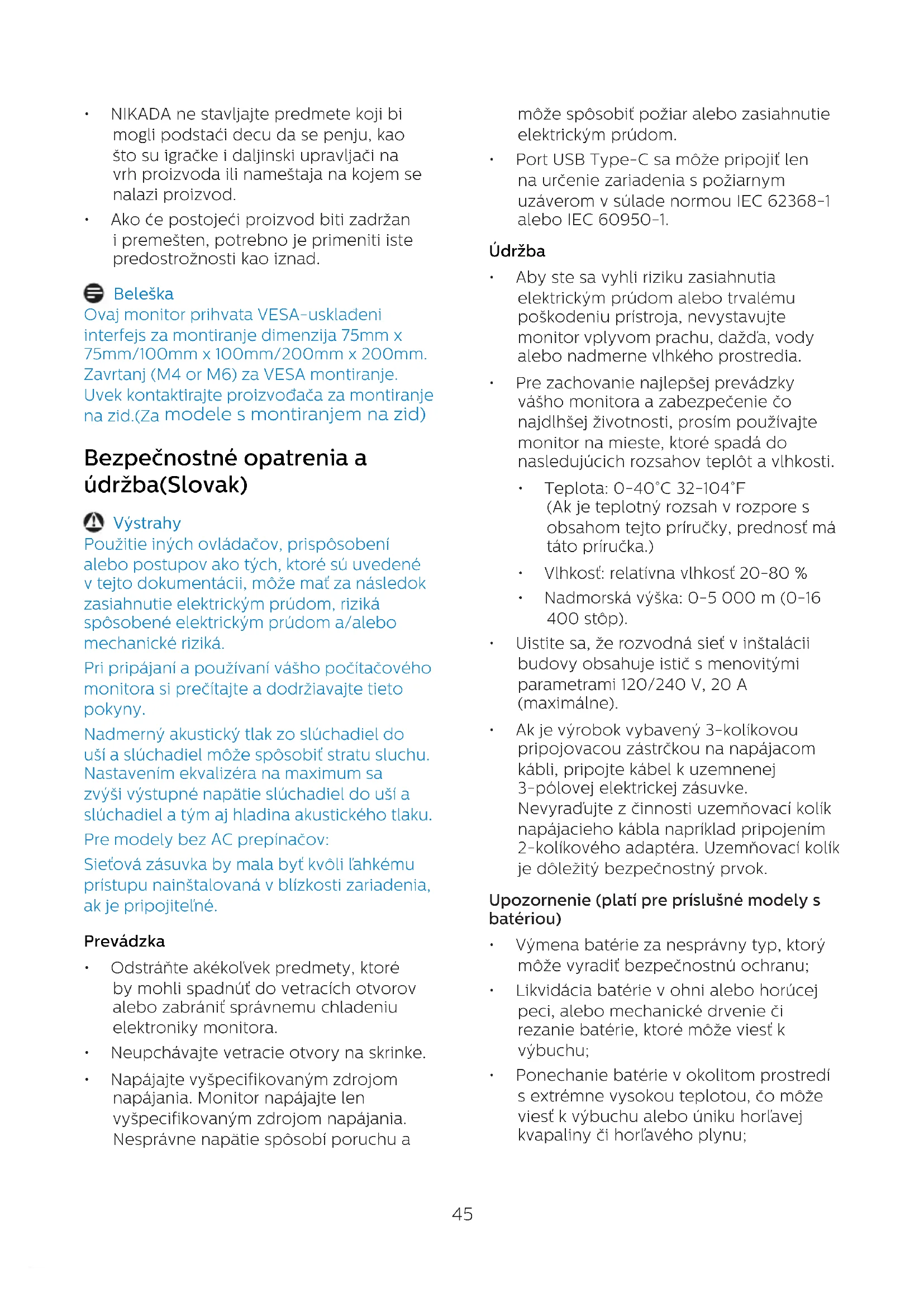 - Ako će postojeći proizvod biti zadržan i premešten, potrebno je primeniti iste predostrožnosti kao iznad. Beleška Ovaj monitor prihvata VESA-usklađeni interfejs za montiranje dimenzija 75mm x 75mm/100mm x 100mm/200mm x 200mm. Zavrtanj (M4 or M6) za VESA montiranje. Uvek kontaktirajte proizvođača za montiranje na zid.(Za modele s montiranjem na zid) Bezpečnostné opatrenia a údržba(Slovak) Výstrahy Použitie iných ovládačov, prispôsobení alebo postupov ako tých, ktoré sú uvedené v tejto dokumentácii, môže mať za následok zasiahnutie elektrickým prúdom, riziká spôsobené elektrickým prúdom a/alebo mechanické riziká. Pri pripájaní a používaní vášho počítačového monitora si prečítajte a dodržiavajte tieto pokyny. Nadmerný akustický tlak zo slúchadiel do uší a slúchadiel môže spôsobiť stratu sluchu. Nastavením ekvalizéra na maximum sa zvýši výstupné napätie slúchadiel do uší a slúchadiel a tým aj hladina akustického tlaku. Pre modely bez AC prepínačov: Sieťová zásuvka by mala byť kvôli ľahkému prístupu nainštalovaná v blízkosti zariadenia, ak je pripojiteľné. Prevádzka