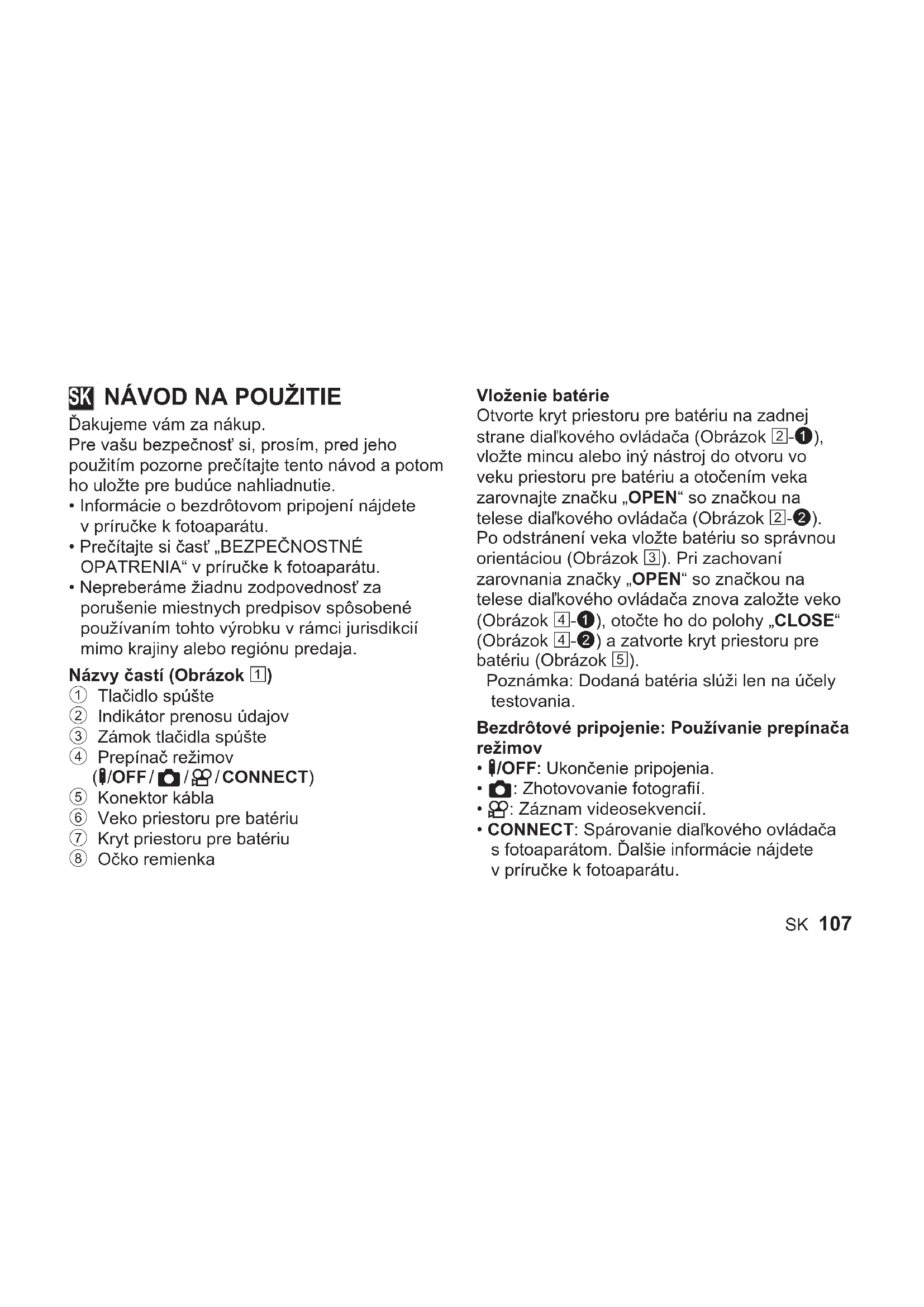 - Nepreberáme žiadnu zodpovednosť za porušenie miestnych predpisov spôsobené používaním tohto výrobku v rámci jurisdikcií mimo krajiny alebo regiónu predaja. Názvy častí (Obrázok 1) 1 Tlačidlo spúšte 2 Indikátor prenosu údajov 3 Zámok tlačidla spúšte 4 Prepínač režimov (b/OFF / K / n / CONNECT) 5 Konektor kábla 6 Veko priestoru pre batériu 7 Kryt priestoru pre batériu 8 Očko remienka Vloženie batérie Otvorte kryt priestoru pre batériu na zadnej strane diaľkového ovládača (Obrázok 2-1), vložte mincu alebo iný nástroj do otvoru vo veku priestoru pre batériu a otočením veka zarovnajte značku „OPEN“ so značkou na telese diaľkového ovládača (Obrázok 2-2). Po odstránení veka vložte batériu so správnou orientáciou (Obrázok 3). Pri zachovaní zarovnania značky „OPEN“ so značkou na telese diaľkového ovládača znova založte veko (Obrázok 4-1), otočte ho do polohy „CLOSE“ (Obrázok 4-2) a zatvorte kryt priestoru pre batériu (Obrázok 5). Poznámka: Dodaná batéria slúži len na účely testovania. Bezdrôtové pripojenie: Používanie prepínača režimov