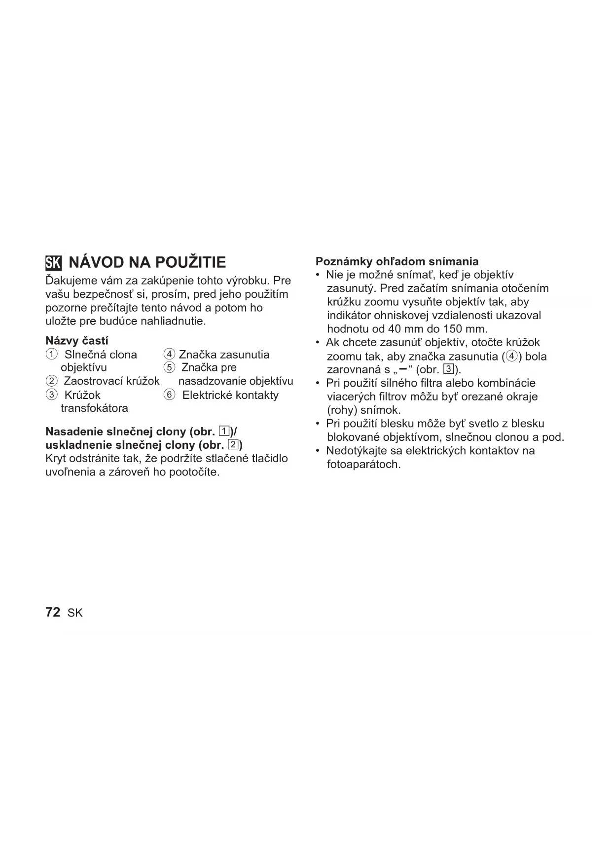 Ďakujeme vám za zakúpenie tohto výrobku. Pre vašu bezpečnosť si, prosím, pred jeho použitím pozorne prečítajte tento návod a potom ho uložte pre budúce nahliadnutie. Názvyčastí 1 Slnečná clona objektívu