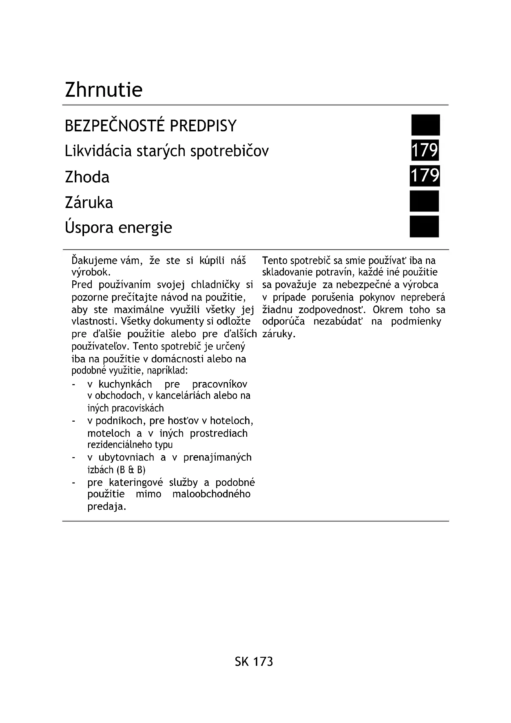 pre kateringové služby a podobné použitie mimo maloobchodného predaja. Tento spotrebič sa smie používať iba na skladovanie potravín, každé iné použitie sa považuje za nebezpečné a výrobca v prípade porušenia pokynov nepreberá žiadnu zodpovednosť. Okrem toho sa odporúča nezabúdať na podmienky záruky.SK 174