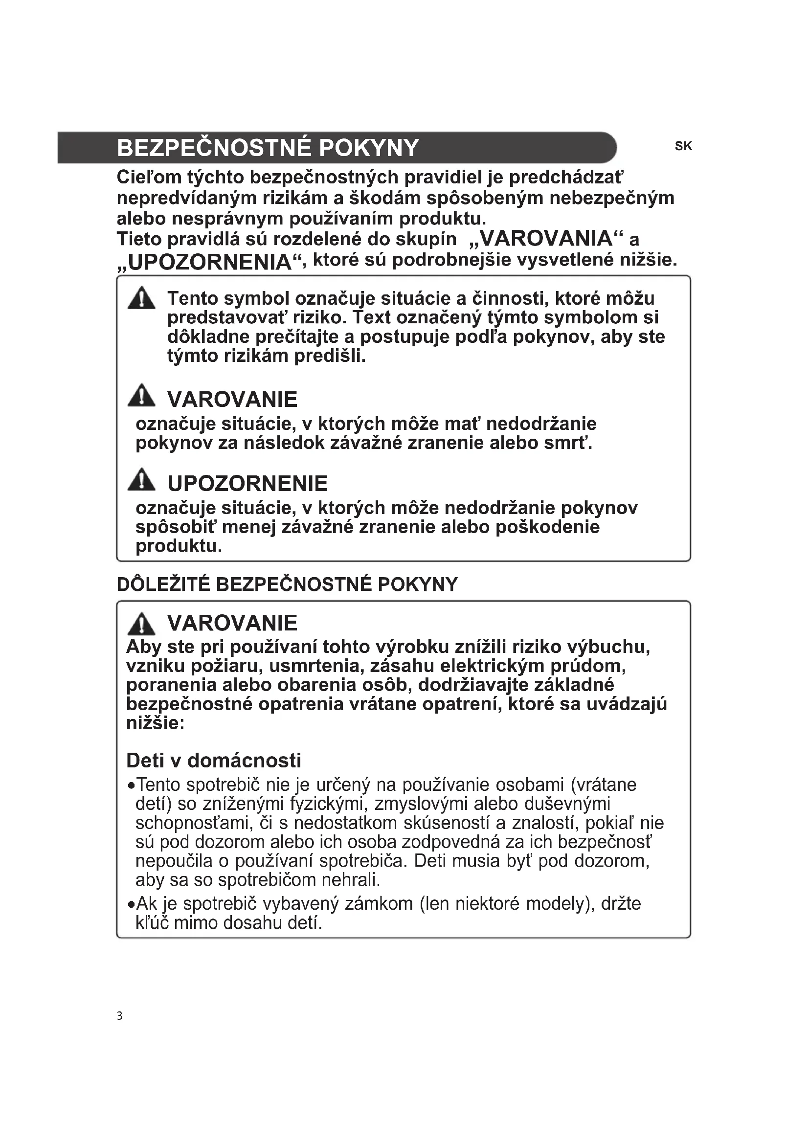 VAROVANIE Aby ste pri používaní tohto výrobku znížili riziko výbuchu, vzniku požiaru, usmrtenia, zásahu elektrickým prúdom, poranenia alebo obarenia osôb, dodržiavajte základné bezpečnostné opatrenia vrátane opatrení, ktoré sa uvádzajú nižšie: Deti v domácnosti