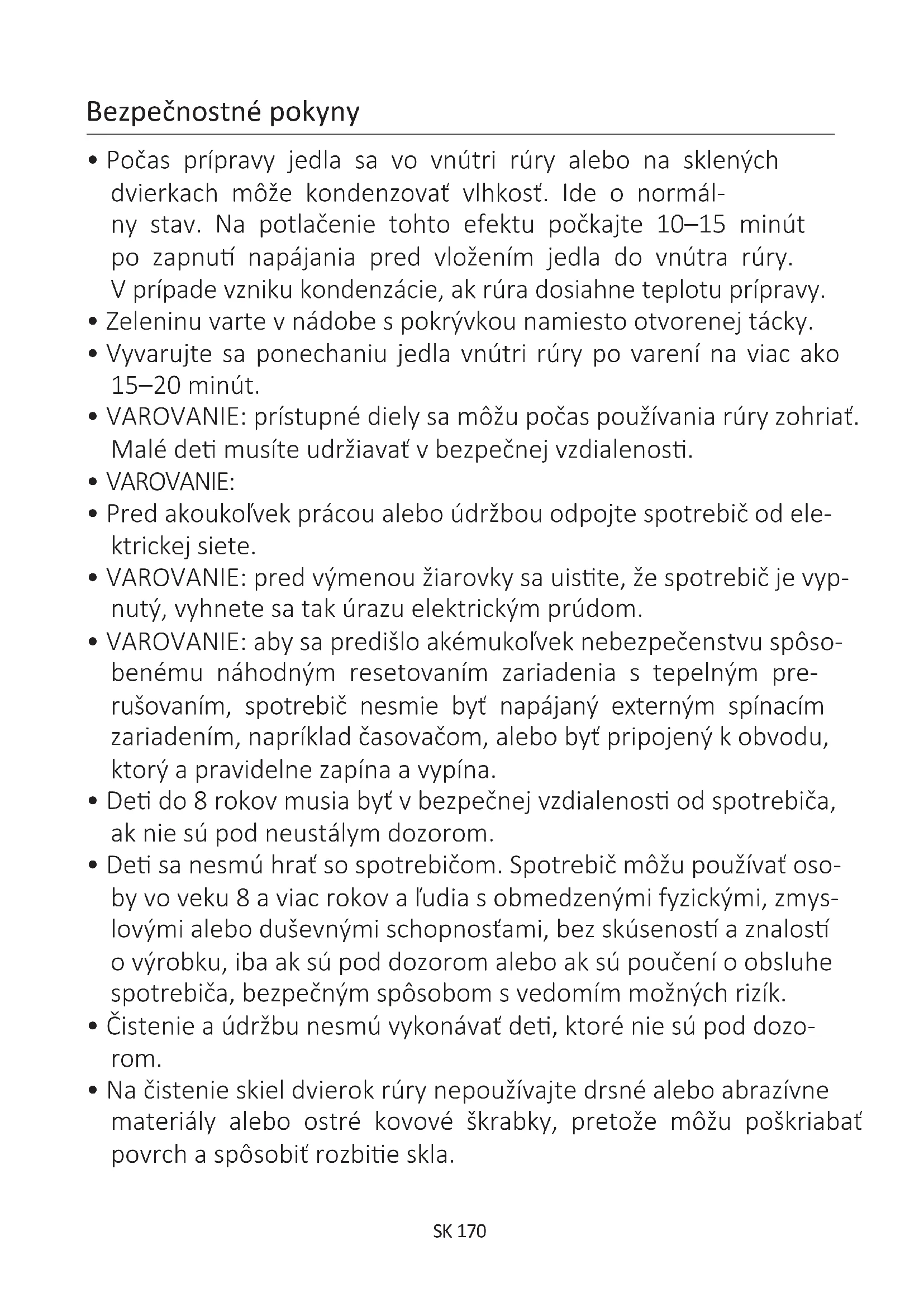 - Na čistenie skiel dvierok rúry nepoužívajte drsné alebo abrazívne materiály alebo ostré kovové škrabky, pretože môžu poškriabať povrch a spôsobiť rozbie skla. Bezpečnostné pokynySK 171