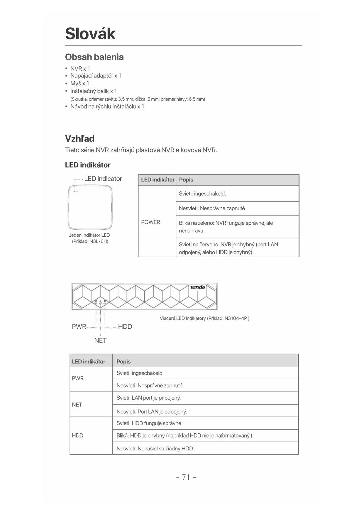 Bežné NVR (príklad: N3L-8H)-73- Uzemňovacia svorka.Pripojte uzemňovaciu svorku NVR k zemi alebo k uzemňovacej svorke budovy pomocou uzemňovacieho kábla, aby ste zabránili poškodeniu NVR statickou elektrinou alebo bleskom.Napájací port.Na zapnutie NVR použite priložený napájací adaptér.Fast Ethernet port, ktorý podporuje napájanie IEEE 802.3af/at PoE. Používa sa na pripojenie ku kamerám.POWER PoE PORTS LAN AUDIO AUDIO OUT HDMI VGA USB Fast Ethernet LAN port.Používa sa na pripojenie k takým zariadeniam, ako je smerovač a prepínač.Audio input port.Used to connect to the audio input devices , such as pickups.Vstupný audio port.Používa sa na pripojenie k vstupným audio zariadeniam, ako sú snímače.HDMI port.Pripojte svoj monitor alebo televízor k tomuto portu pomocou kábla HDMI pre výstup zvuku a videa.VGA port.Pripojte monitor k tomuto portu pomocou kábla VGA pre výstup videa.Port USB 2.0.Používa sa na pripojenie k takým zariadeniam, ako je myš a úložné zariadenie USB. PopisPort Tips - Odporúčaný ethernetový kábel: CAT 5 alebo lepší. - Vzdialenosť napájacieho zdroja: