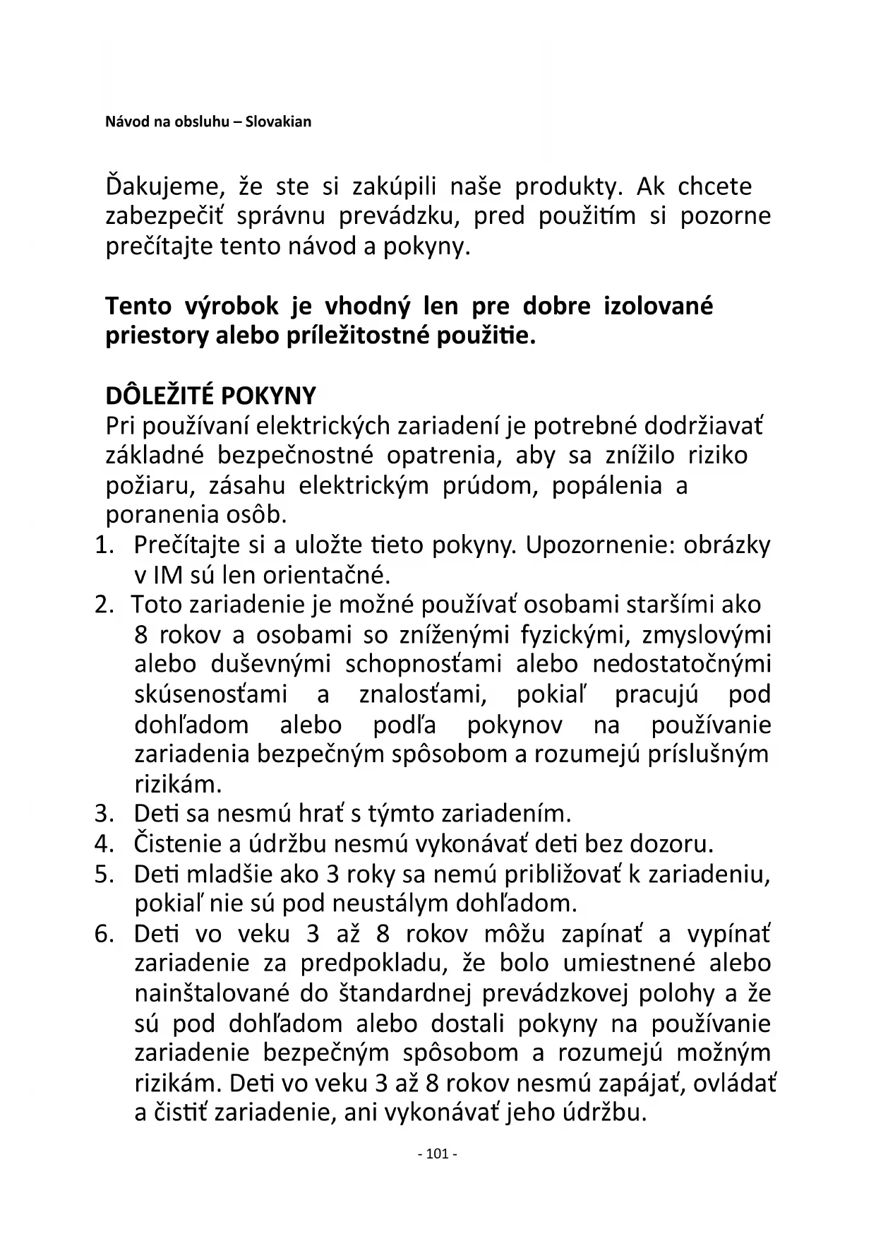 zariadenie za predpokladu, že bolo umiestnené alebo nainštalované do štandardnej prevádzkovej polohy a že sú pod dohľadom alebo dostali pokyny na používanie zariadenie bezpečným spôsobom a rozumejú možným rizikám. Deti vo veku 3 až 8 rokov nesmú zapájať, ovládať a čistiť zariadenie, ani vykonávať jeho údržbu.- 102 -