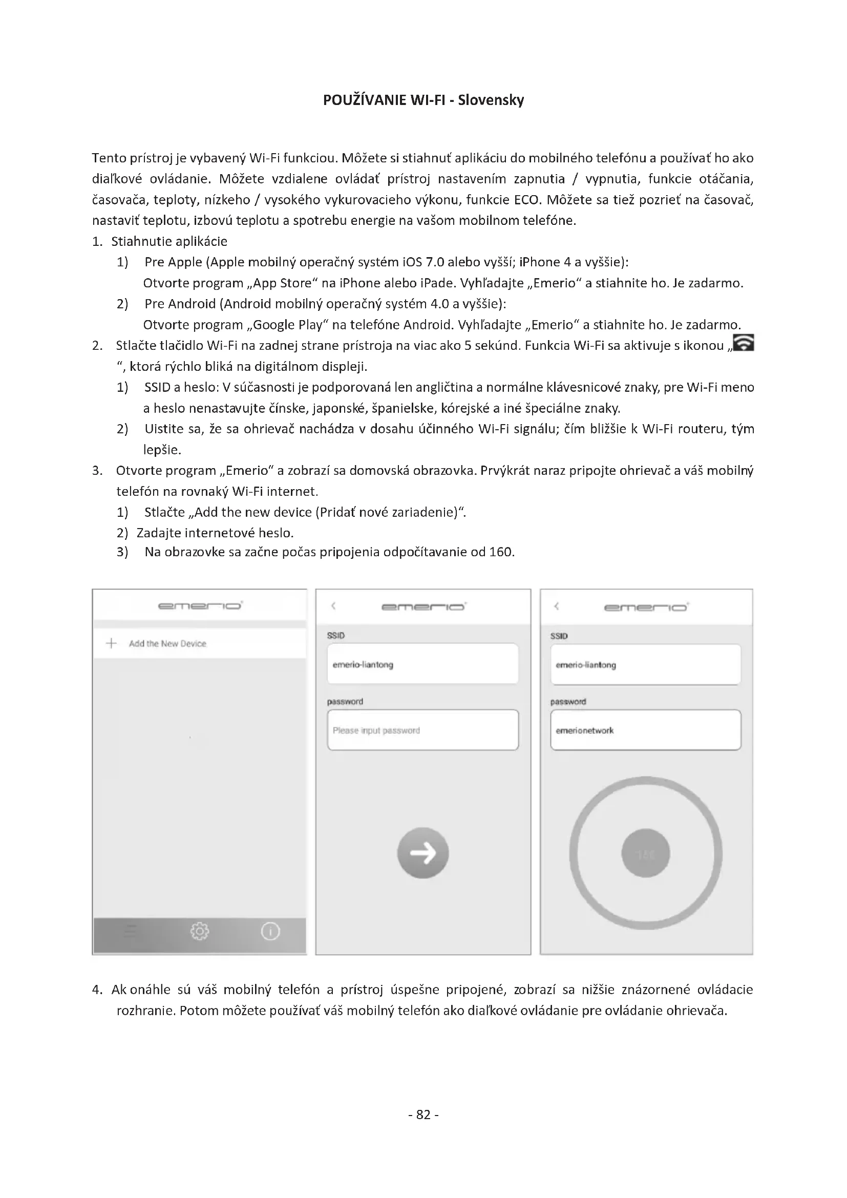 Dátové siete Aj v stave bez Wi-Fi signálu sa mobilný telefón môže stále pripojiť ohrievač. Najprv vypnite Wi-Fi nastavenie a potom otvorte dátovú sieť (Preverte, či je prístroj v sieti 3G/4G.). Po asi 30 s je možné vyhľadať zariadenie. Vzhľadom na nestálosť 3G / 4G môže vzniknúť 1-2 s oneskorenie, čo je normálne. Dátovú sieť je možné použiť, ak sa mobilný telefón predtým najprv spojil s ohrievačom cez Wi-Fi.- 86 - UPORABA OMREŽJA WI-FI - Slovenščina Ta izdelek je opremljen s funkcijo Wi-Fi. Na vaš mobilni telefon lahko prenesete aplikacijo in ga uporabljate kot daljinski upravljalnik. Enoto lahko nadzirate z velike razdalje tako, da nastavite vklop/izklop, funkcijo nihanja, časovnik, temperaturo, nizko/visoko moč gretja, funkcijo ECO. Na mobilnem telefonu lahko preverite tudi časovnik, nastavljeno temperaturo, sobno temperaturo in porabo energije.