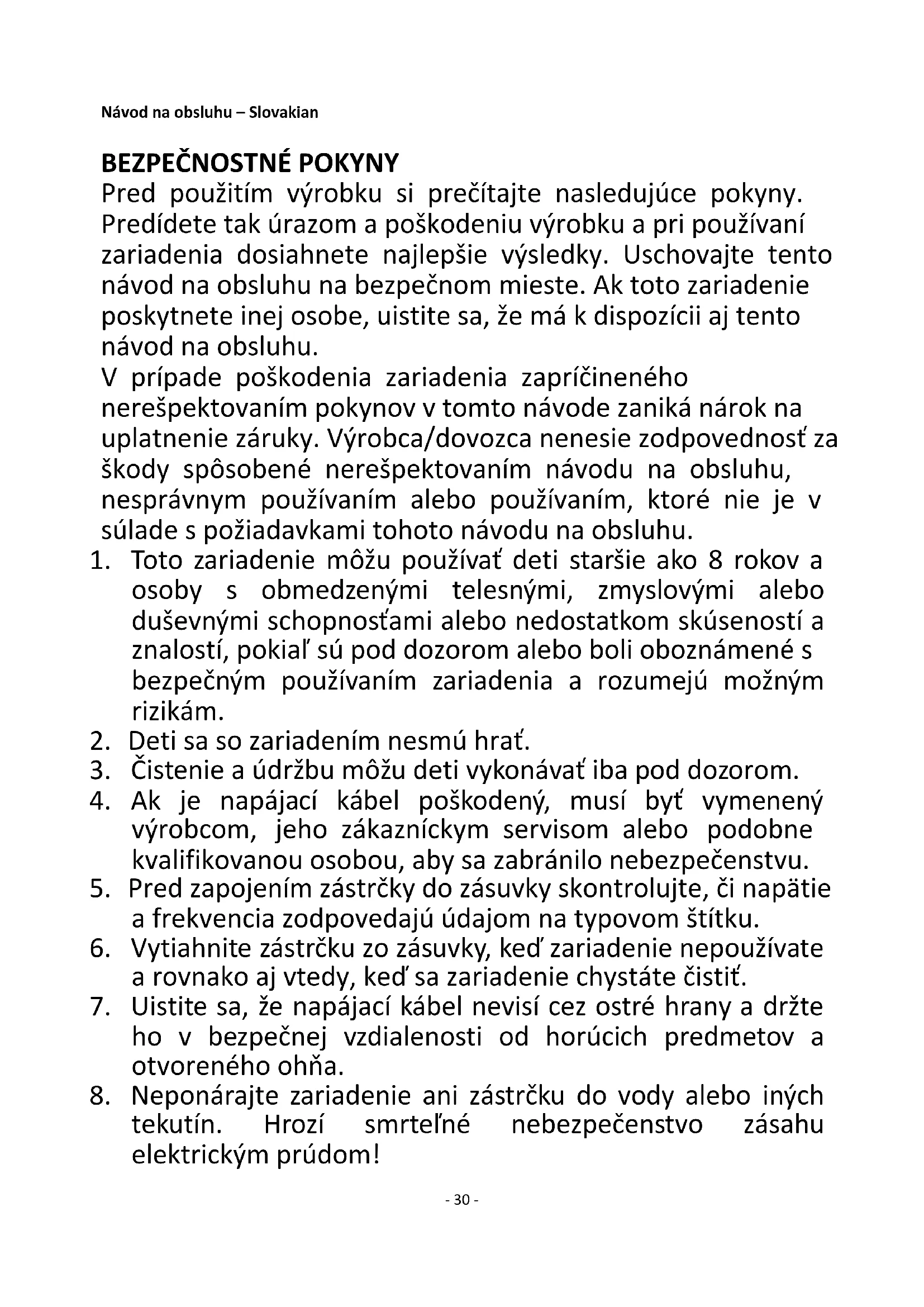 Pred použitím výrobku si prečítajte nasledujúce pokyny. Predídete tak úrazom a poškodeniu výrobku a pri používaní zariadenia dosiahnete najlepšie výsledky. Uschovajte tento návod na obsluhu na bezpečnom mieste. Ak toto zariadenie poskytnete inej osobe, uistite sa, že má k dispozícii aj tento návod na obsluhu. V prípade poškodenia zariadenia zapríčineného nerešpektovaním pokynov v tomto návode zaniká nárok na uplatnenie záruky. Výrobca/dovozca nenesie zodpovednosť za škody spôsobené nerešpektovaním návodu na obsluhu, nesprávnym používaním alebo používaním, ktoré nie je v súlade s požiadavkami tohoto návodu na obsluhu.
