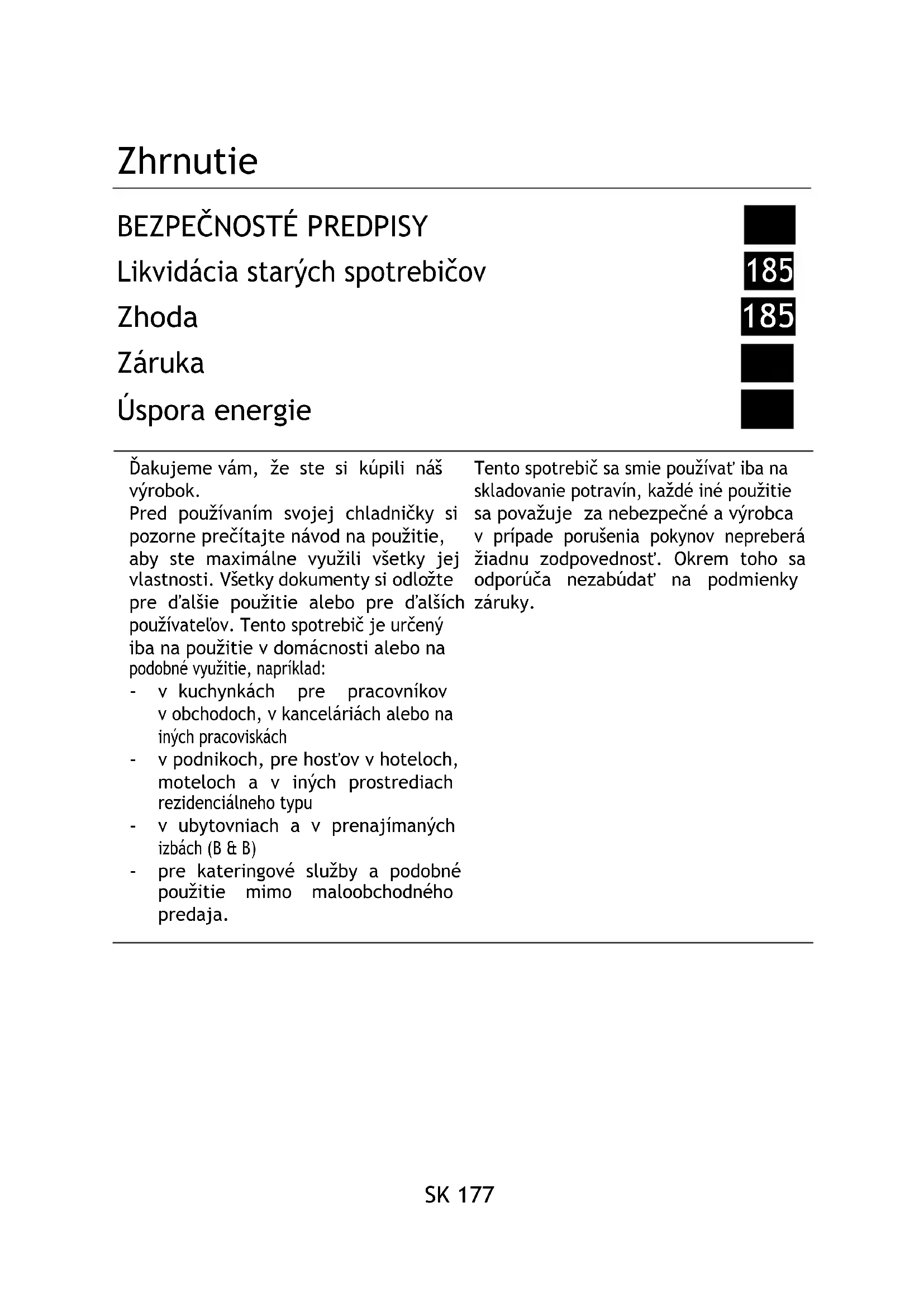 pre kateringové služby a podobné použitie mimo maloobchodného predaja. Tento spotrebič sa smie používať iba na skladovanie potravín, každé iné použitie sa považuje za nebezpečné a výrobca v prípade porušenia pokynov nepreberá žiadnu zodpovednosť. Okrem toho sa odporúča nezabúdať na podmienky záruky.SK 178