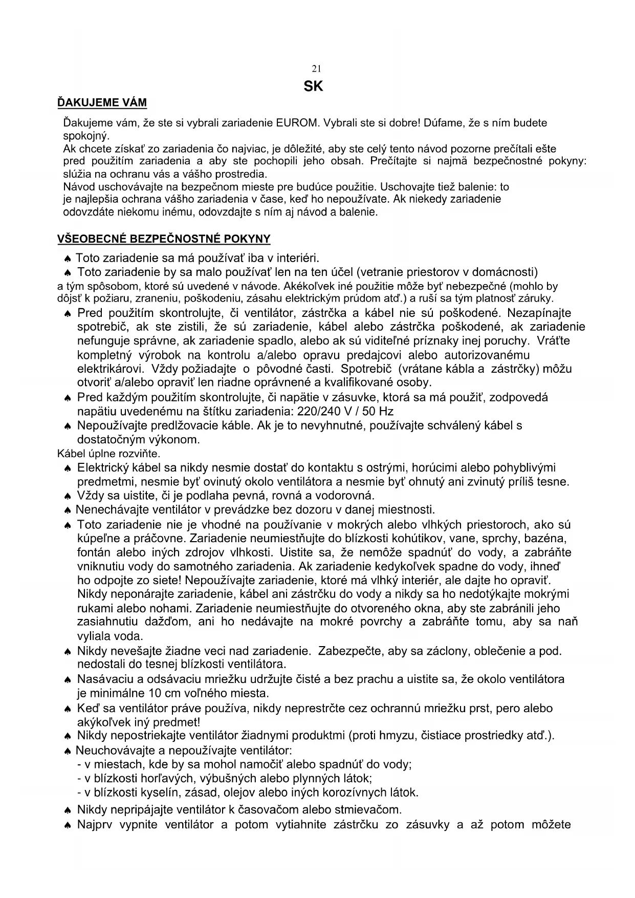 Toto zariadenie sa má používať iba v interiéri. Toto zariadenie by sa malo používať len na ten účel (vetranie priestorov v domácnosti) a tým spôsobom, ktoré sú uvedené v návode. Akékoľvek iné použitie môže byť nebezpečné (mohlo by dôjsť k požiaru, zraneniu, poškodeniu, zásahu elektrickým prúdom atď.) a ruší sa tým platnosť záruky. Pred použitím skontrolujte, či ventilátor, zástrčka a kábel nie sú poškodené. Nezapínajte spotrebič, ak ste zistili, že sú zariadenie, kábel alebo zástrčka poškodené, ak zariadenie nefunguje správne, ak zariadenie spadlo, alebo ak sú viditeľné príznaky inej poruchy. Vráťte kompletný výrobok na kontrolu a/alebo opravu predajcovi alebo autorizovanému elektrikárovi. Vždy požiadajte o pôvodné časti. Spotrebič (vrátane kábla a zástrčky) môžu otvoriť a/alebo opraviť len riadne oprávnené a kvalifikované osoby. Pred každým použitím skontrolujte, či napätie v zásuvke, ktorá sa má použiť, zodpovedá napätiu uvedenému na štítku zariadenia: 220/240 V / 50 Hz Nepoužívajte predlžovacie káble. Ak je to nevyhnutné, používajte schválený kábel s dostatočným výkonom. Kábel úplne rozviňte. Elektrický kábel sa nikdy nesmie dostať do kontaktu s ostrými, horúcimi alebo pohyblivými predmetmi, nesmie byť ovinutý okolo ventilátora a nesmie byť ohnutý ani zvinutý príliš tesne. Vždy sa uistite, či je podlaha pevná, rovná a vodorovná. Nenechávajte ventilátor v prevádzke bez dozoru v danej miestnosti. Toto zariadenie nie je vhodné na používanie v mokrých alebo vlhkých priestoroch, ako sú kúpeľne a práčovne. Zariadenie neumiestňujte do blízkosti kohútikov, vane, sprchy, bazéna, fontán alebo iných zdrojov vlhkosti. Uistite sa, že nemôže spadnúť do vody, a zabráňte vniknutiu vody do samotného zariadenia. Ak zariadenie kedykoľvek spadne do vody, ihneď ho odpojte zo siete! Nepoužívajte zariadenie, ktoré má vlhký interiér, ale dajte ho opraviť. Nikdy neponárajte zariadenie, kábel ani zástrčku do vody a nikdy sa ho nedotýkajte mokrými rukami alebo nohami. Zariadenie neumiestňujte do otvoreného okna, aby ste zabránili jeho zasiahnutiu dažďom, ani ho nedávajte na mokré povrchy a zabráňte tomu, aby sa naň vyliala voda. Nikdy nevešajte žiadne veci nad zariadenie. Zabezpečte, aby sa záclony, oblečenie a pod. nedostali do tesnej blízkosti ventilátora. Nasávaciu a odsávaciu mriežku udržujte čisté a bez prachu a uistite sa, že okolo ventilátora je minimálne 10 cm voľného miesta. Keď sa ventilátor práve používa, nikdy neprestrčte cez ochrannú mriežku prst, pero alebo akýkoľvek iný predmet! Nikdy nepostriekajte ventilátor žiadnymi produktmi (proti hmyzu, čistiace prostriedky atď.). Neuchovávajte a nepoužívajte ventilátor: - v miestach, kde by sa mohol namočiť alebo spadnúť do vody; - v blízkosti horľavých, výbušných alebo plynných látok; - v blízkosti kyselín, zásad, olejov alebo iných korozívnych látok. Nikdy nepripájajte ventilátor k časovačom alebo stmievačom. Najprv vypnite ventilátor a potom vytiahnite zástrčku zo zásuvky a až potom môžete22