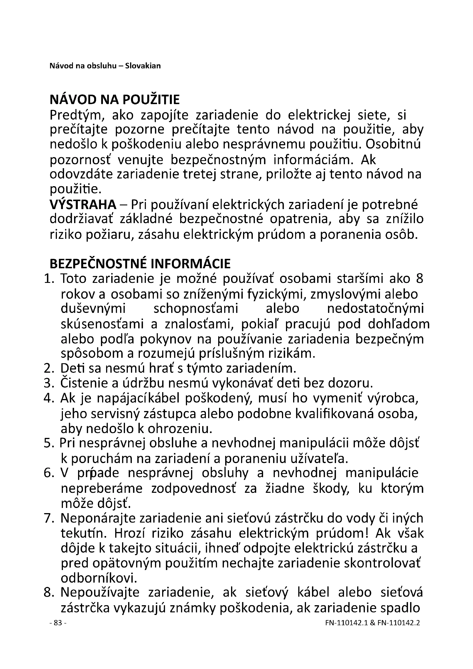 zástrčka vykazujú známky poškodenia, ak zariadenie spadlo- 84 - FN-110142.1 & FN-110142.2 na dlážku alebo sa inak poškodilo. V takýchto prípadoch odovzdajte zariadenie odborníkovi na kontrolu a v prípade potreby opravu.