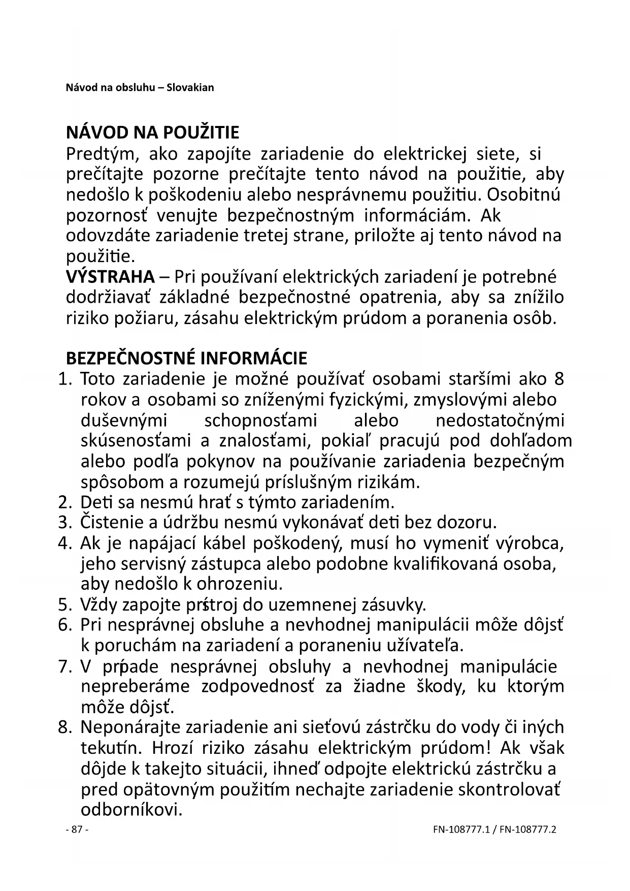 tekutín. Hrozí riziko zásahu elektrickým prúdom! Ak však dôjde k takejto situácii, ihneď odpojte elektrickú zástrčku a pred opätovným použitím nechajte zariadenie skontrolovať odborníkovi.- 88 - FN-108777.1 / FN-108777.2