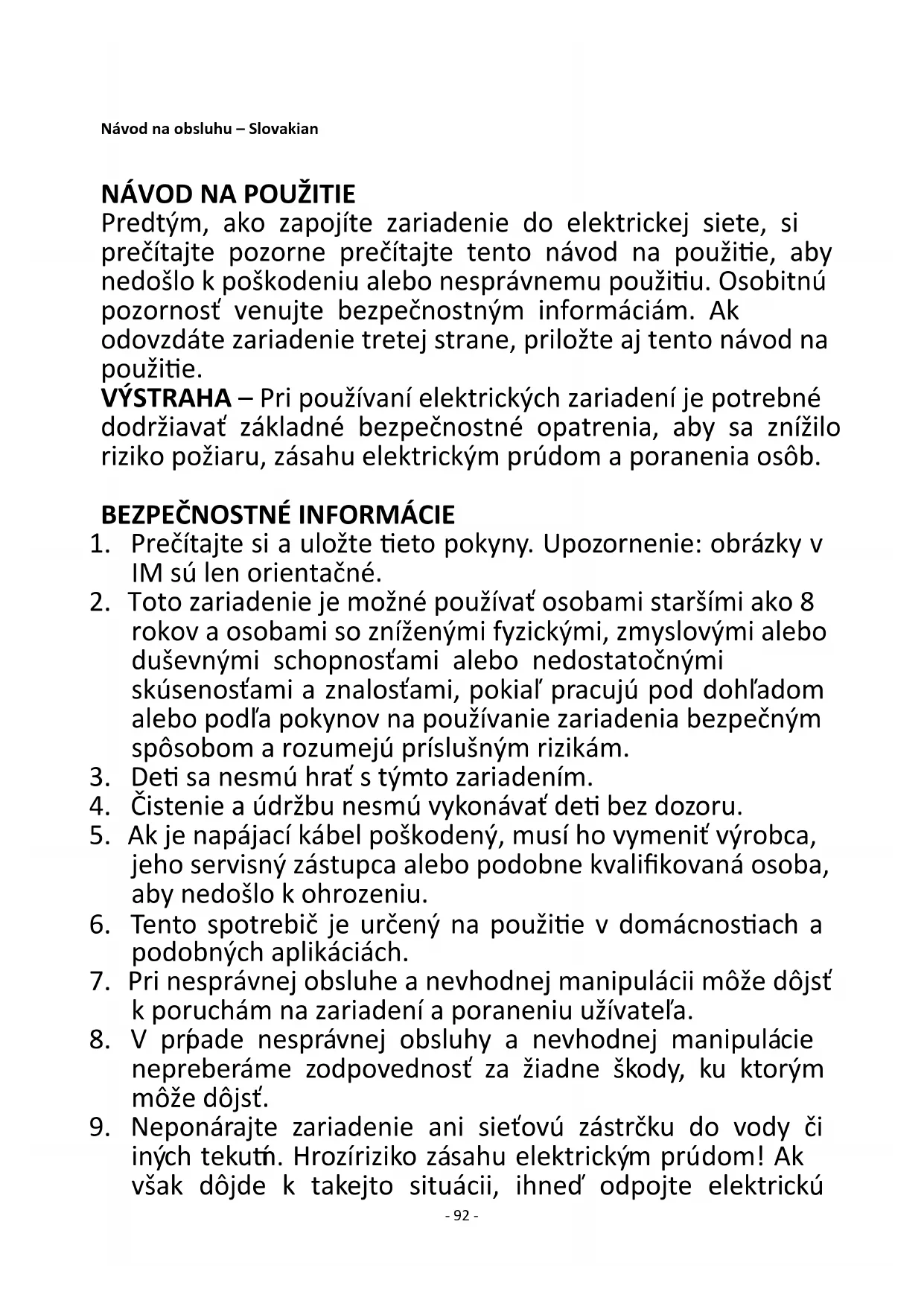 Predtým, ako zapojíte zariadenie do elektrickej siete, si prečítajte pozorne prečítajte tento návod na použitie, aby nedošlo k poškodeniu alebo nesprávnemu použitiu. Osobitnú pozornosť venujte bezpečnostným informáciám. Ak odovzdáte zariadenie tretej strane, priložte aj tento návod na použitie. VÝSTRAHA – Pri používaní elektrických zariadení je potrebné dodržiavať základné bezpečnostné opatrenia, aby sa znížilo riziko požiaru, zásahu elektrickým prúdom a poranenia osôb.