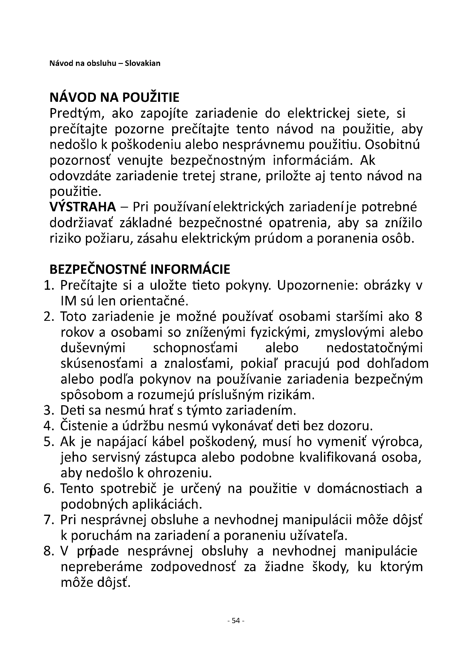 Predtým, ako zapojíte zariadenie do elektrickej siete, si prečítajte pozorne prečítajte tento návod na použitie, aby nedošlo k poškodeniu alebo nesprávnemu použitiu. Osobitnú pozornosť venujte bezpečnostným informáciám. Ak odovzdáte zariadenie tretej strane, priložte aj tento návod na použitie. VÝSTRAHA – Pri používaní elektrických zariadení je potrebné dodržiavať základné bezpečnostné opatrenia, aby sa znížilo riziko požiaru, zásahu elektrickým prúdom a poranenia osôb.