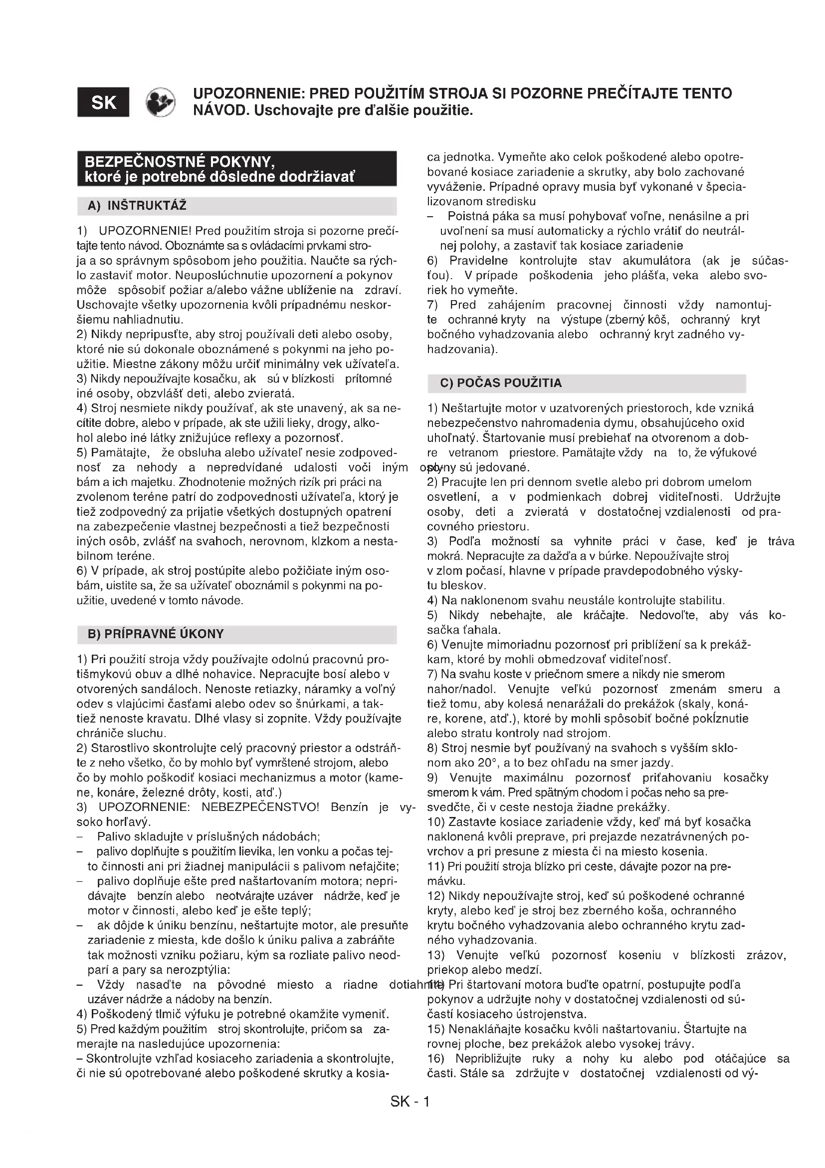 1) UPOZORNENIE! Pred použitím stroja si pozorne prečí- tajte tento návod. Oboznámte sa s ovládacími prvkami stro- ja a so správnym spôsobom jeho použitia. Naučte sa rých- lo zastaviť motor. Neuposlúchnutie upozornení a pokynov môže spôsobiť požiar a/alebo vážne ublíženie na zdraví. Uschovajte všetky upozornenia kvôli prípadnému neskor- šiemu nahliadnutiu. 2) Nikdy nepripusťte, aby stroj používali deti alebo osoby, ktoré nie sú dokonale oboznámené s pokynmi na jeho po- užitie. Miestne zákony môžu určiť minimálny vek užívateľa. 3) Nikdy nepoužívajte kosačku, ak sú v blízkosti prítomné iné osoby, obzvlášť deti, alebo zvieratá. 4) Stroj nesmiete nikdy používať, ak ste unavený, ak sa ne- cítite dobre, alebo v prípade, ak ste užili lieky, drogy, alko- hol alebo iné látky znižujúce reexy a pozornosť. 5) Pamätajte, že obsluha alebo užívateľ nesie zodpoved- nosť za nehody a nepredvídané udalosti voči iným oso- bám a ich majetku. Zhodnotenie možných rizík pri práci na zvolenom teréne patrí do zodpovednosti užívateľa, ktorý je tiež zodpovedný za prijatie všetkých dostupných opatrení na zabezpečenie vlastnej bezpečnosti a tiež bezpečnosti iných osôb, zvlášť na svahoch, nerovnom, klzkom a nesta- bilnom teréne. 6) V prípade, ak stroj postúpite alebo požičiate iným oso- bám, uistite sa, že sa užívateľ oboznámil s pokynmi na po- užitie, uvedené v tomto návode.