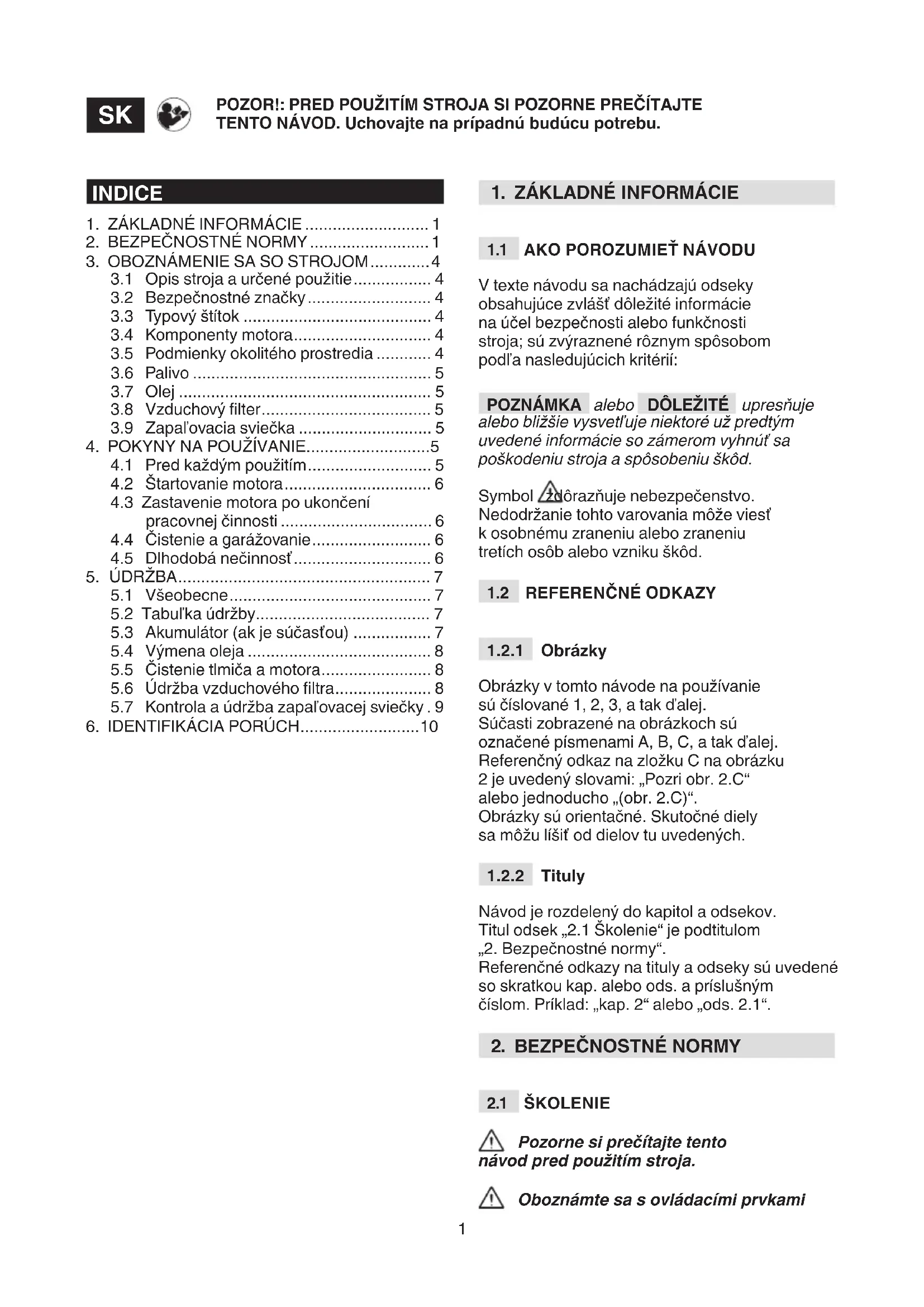 Návod je rozdelený do kapitol a odsekov. Titul odsek „2.1 Školenie“ je podtitulom „2. Bezpečnostné normy“. Referenčné odkazy na tituly a odseky sú uvedené so skratkou kap. alebo ods. a príslušným číslom. Príklad: „kap. 2“ alebo „ods. 2.1“.