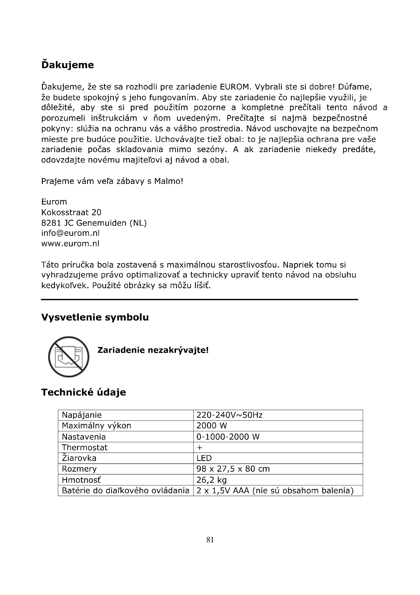 CE-prohlášení Eurom - Genemuiden-NL prohlašuje, že elektrická okrasná kamna EUROM, typ Malmo, odpovídá předpisu LVD 2014/35/EU a směrnici EMC 2014/30/EU a že je v souladu s následujícími normami: EN 60335-1:2012+AC :2014+A11:2014 EN 55014-1:2006+A1:2009+A2:2011 EN 60335-2-30:2009+A11:2012 EN 55014-2:2015 EN 62233:2008 EN 61000-3-2:2014 RoHS 2011/65/EU&(EU)2015/863 EN 61000-3-3:2013 Genemuiden, 07-06-2019 W.J. Bakker, alg. dir.81 Ďakujeme Ďakujeme, že ste sa rozhodli pre zariadenie EUROM. Vybrali ste si dobre! Dúfame, že budete spokojný s jeho fungovaním. Aby ste zariadenie čo najlepšie využili, je dôležité, aby ste si pred použitím pozorne a kompletne prečítali tento návod a porozumeli inštrukciám v ňom uvedeným. Prečítajte si najmä bezpečnostné pokyny: slúžia na ochranu vás a vášho prostredia. Návod uschovajte na bezpečnom mieste pre budúce použitie. Uchovávajte tiež obal: to je najlepšia ochrana pre vaše zariadenie počas skladovania mimo sezóny. A ak zariadenie niekedy predáte, odovzdajte novému majiteľovi aj návod a obal. Prajeme vám veľa zábavy s Malmo! Eurom Kokosstraat 20 8281 JC Genemuiden (NL) info@eurom.nl www.eurom.nl Táto príručka bola zostavená s maximálnou starostlivosťou. Napriek tomu si vyhradzujeme právo optimalizovať a technicky upraviť tento návod na obsluhu kedykoľvek. Použité obrázky sa môžu líšiť.